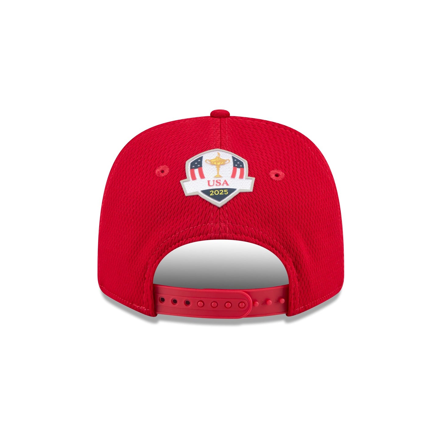 The 2025 Ryder Cup Team USA Red 9SEVENTY Stretch-Snap features an embroidered Team USA logo and raised stars at both sides of the front panels. Additional details include a Ryder Cup pin at the front left panel, a silicone Ryder Cup logo above an adjustable snapback closure at the rear, and a gray undervisor.