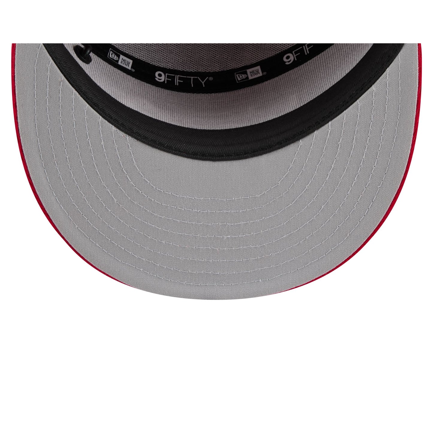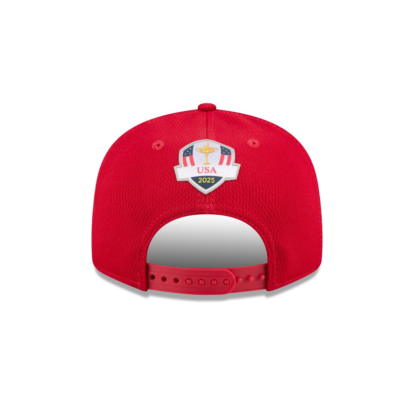 The 2025 Ryder Cup Team USA Red Split Panel 9FIFTY Snapback features an embroidered Team USA logo and raised stars at both sides of the front panels against a split-crown construction. Additional details include a Ryder Cup pin at the front left panel, a silicone Ryder Cup logo above an adjustable snapback closure at the rear, and a gray undervisor.