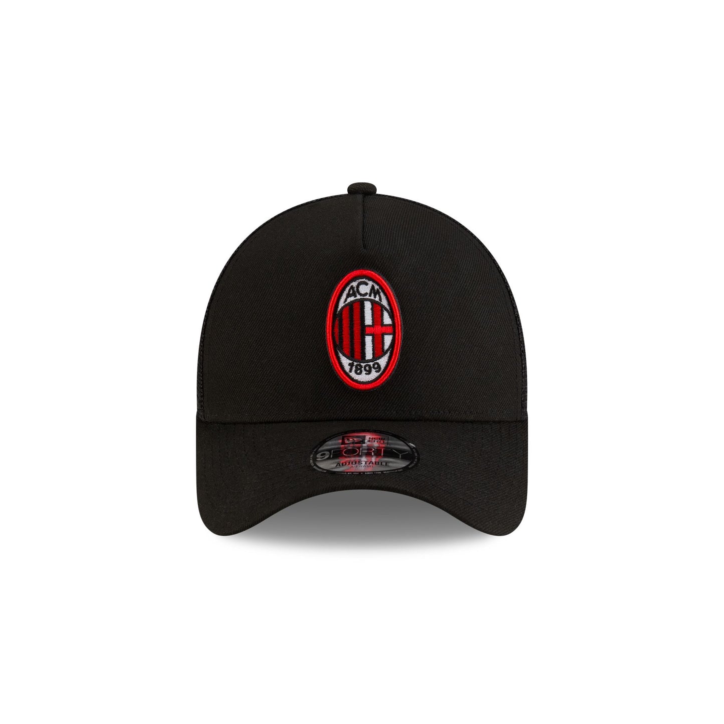 The AC Milan Black 9FORTY A-Frame Trucker Hat features an embroidered AC Milan logo at the front panels with a snapback closure at a mesh rear and a gray undervisor.