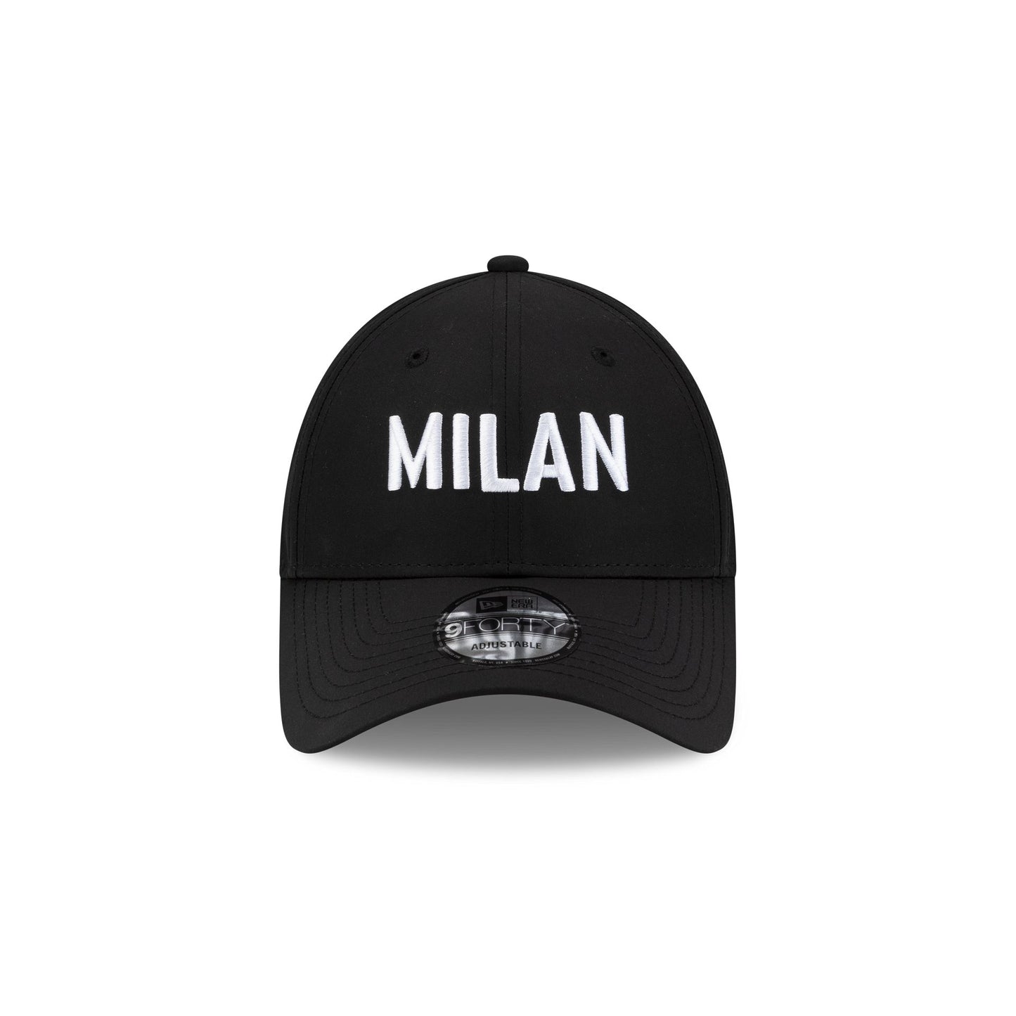 The AC Milan Wordmark Black 9FORTY Adjustable Cap features an embroidered Milan wordmark at the front panels with a team logo at the right-wear side. Additional details include an adjustable D-Ring closure at the rear and a red undervisor.