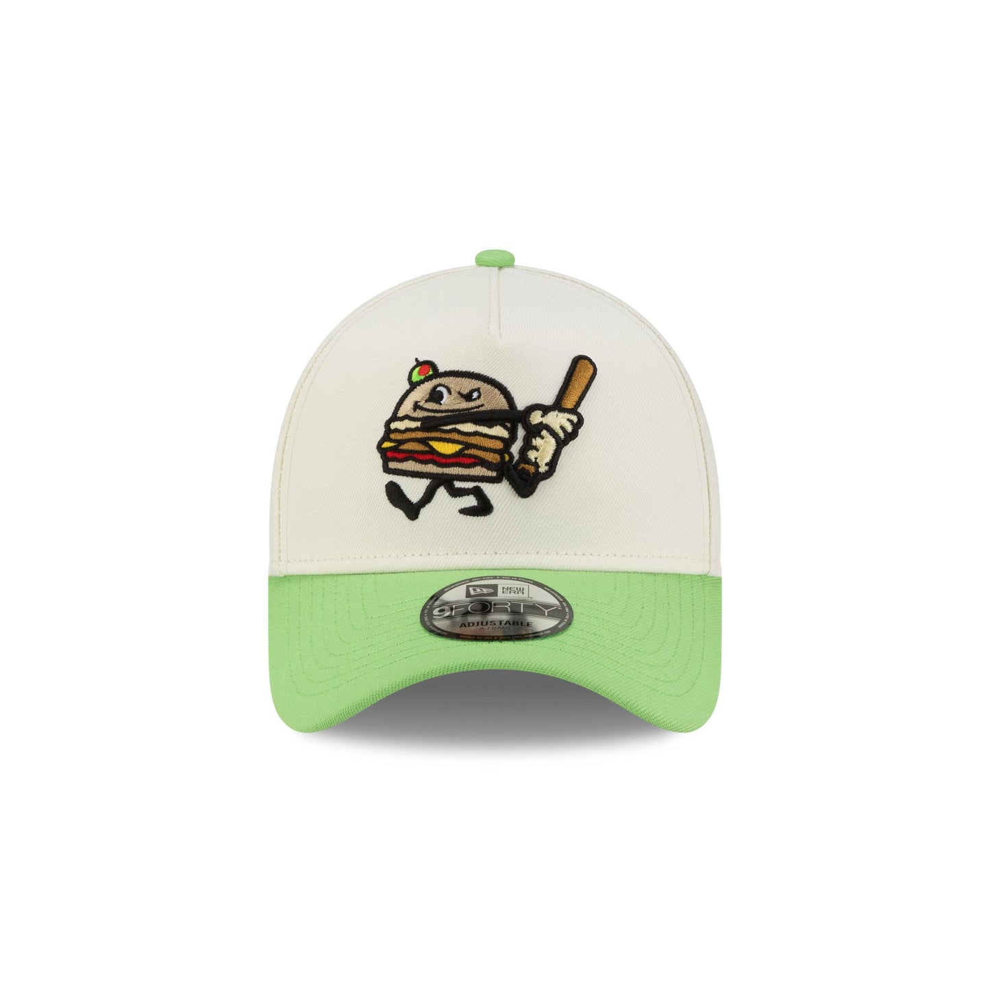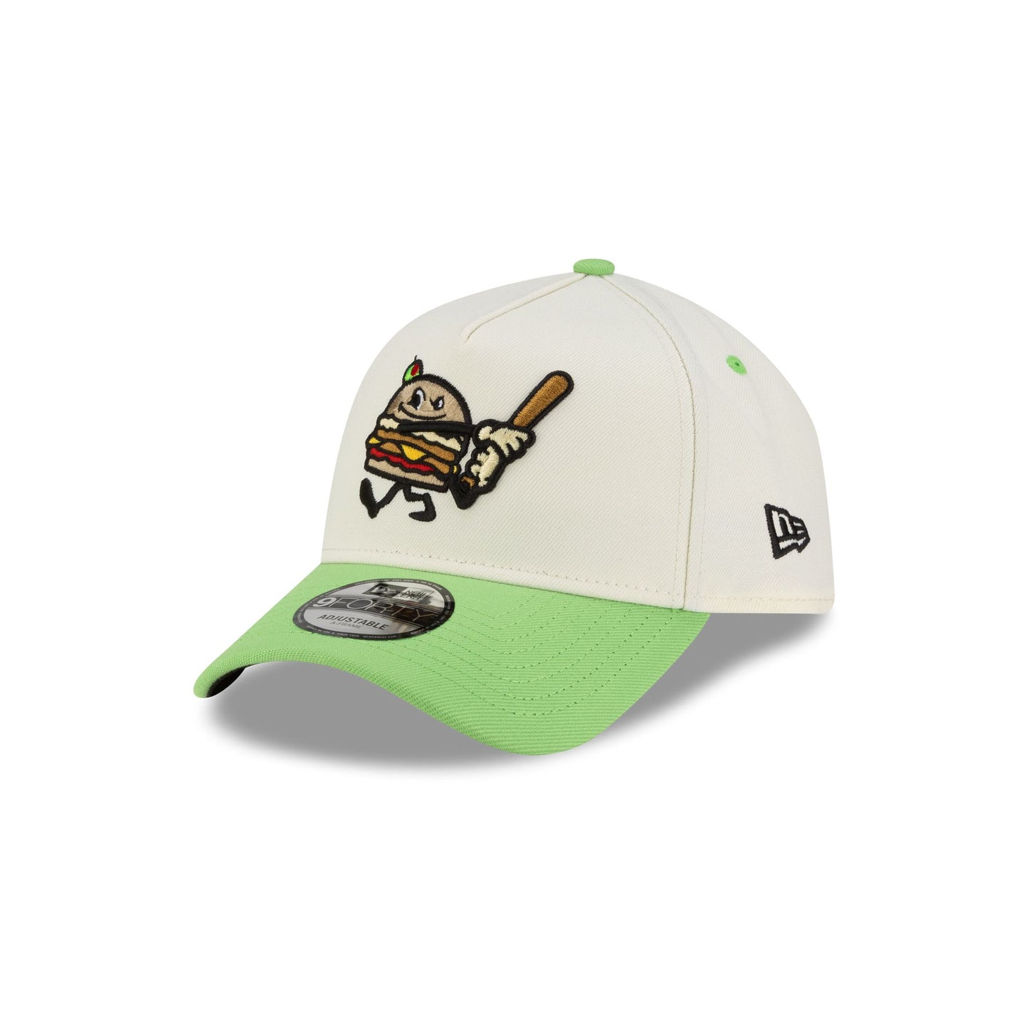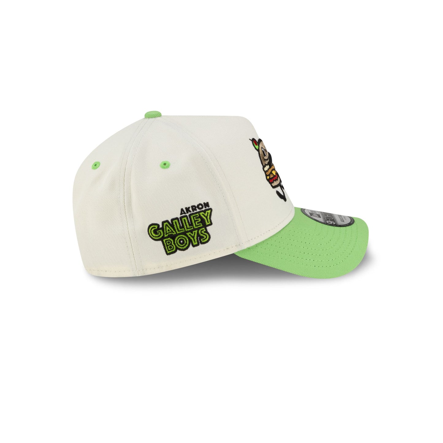The Akron RubberDucks Chrome Food Pack 9FORTY A-Frame Snapback features an embroidered RubberDucks cheeseburger themed logo at the front panels with a snapback closure logo at the rear. Additional details include a Galley Boys team wordmark at the right-wear side with a green visor and a black undervisor.