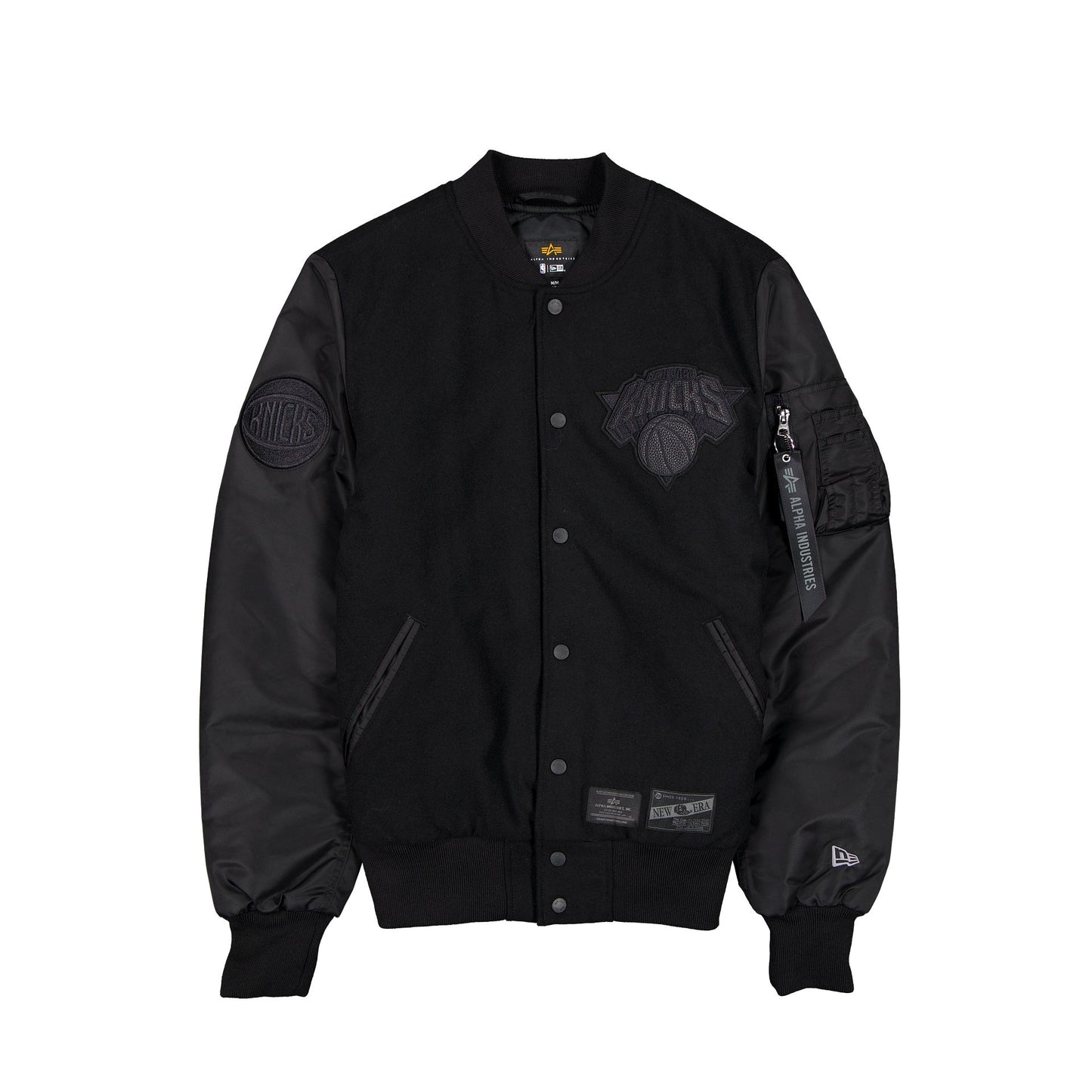 The Alpha Industries x New York Knicks MA-1 Wool Varsity Jacket Black features a felt applique Knicks logo at the left chest with a matching team logo and wordmark at the rear. Additional details include a utility pocket with the Alpha Industries ribbon at the left sleeve and an embroidered Knicks patch at the right sleeve.