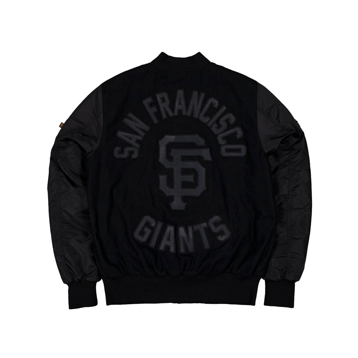 The Alpha Industries x San Francisco Giants MA-1 Wool Varsity Jacket Black features a faux leather applique Giants logo at the left chest with a matching team logo and wordmark at the rear. Additional details include a utility pocket with the Alpha Industries ribbon at the left sleeve and an embroidered Giants patch at the right sleeve.