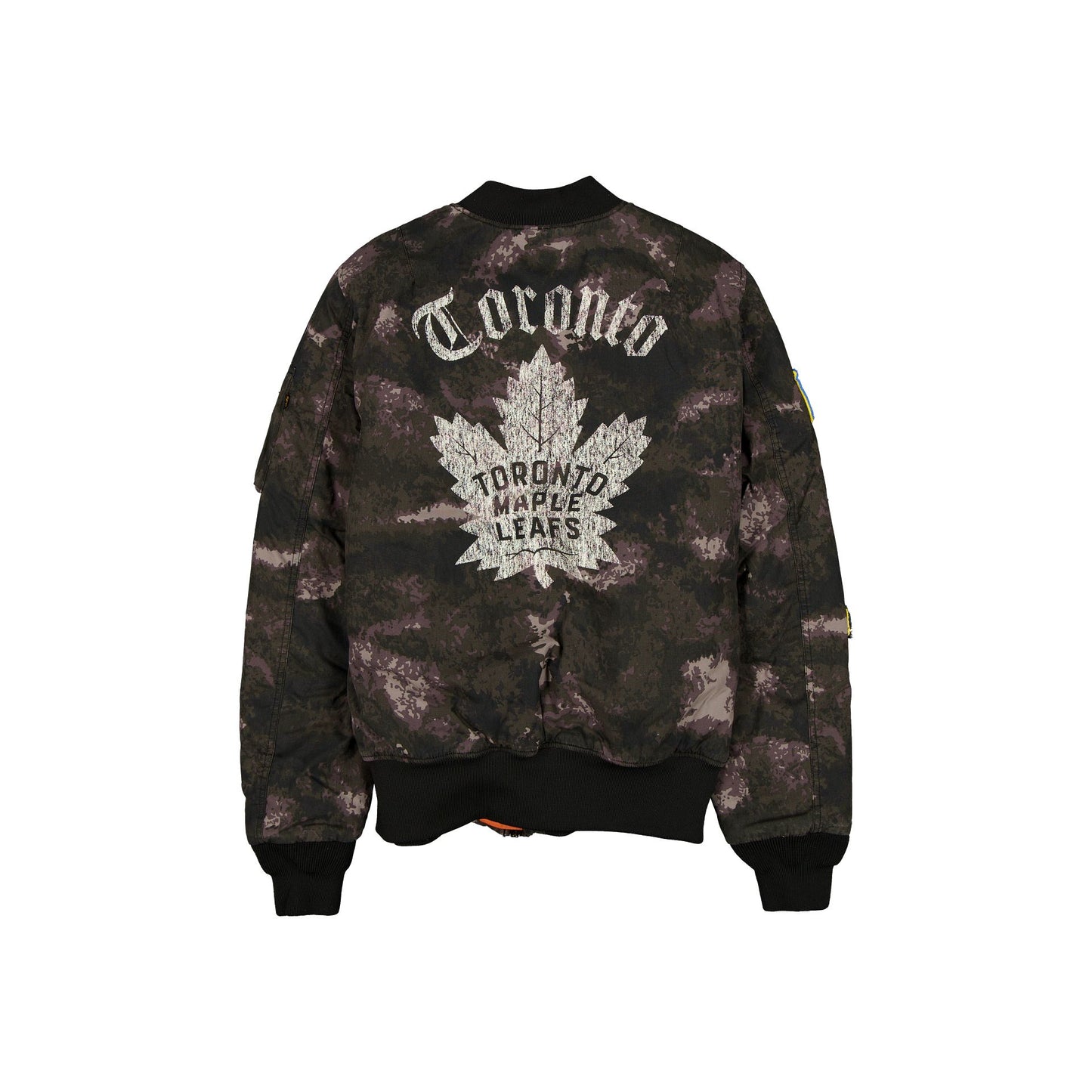 The Alpha Industries x Toronto Maple Leafs Black Camo MA-1 Bomber Jacket features a screen-printed Maple Leafs logo at the right chest with a matching team graphic at the rear, a full-zip closure at the front, and a woven New Era Cap x Alpha Industries tag at the hem. Additional details include a frayed edge alternate team logo at the left chest with a Toronto flag, New Era Cap patch, and Ontario flower patch at the right sleeve. Further details include the Scotiabank Arena blueprint at the interior lining.