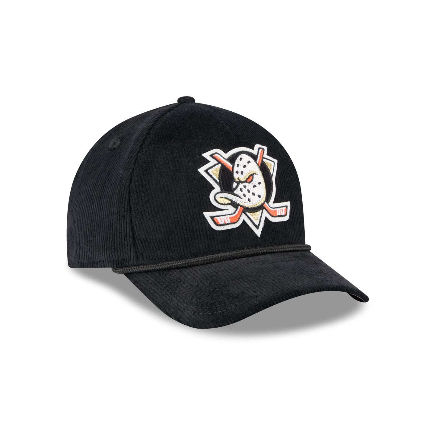 The Anaheim Ducks Corduroy 9FORTY M-Crown A-Frame Snapback features an embroidered Ducks logo at the front panels with a corduroy fabrication throughout and a rope at the visor. Additional details include a snapback closure at the rear and a gray undervisor.