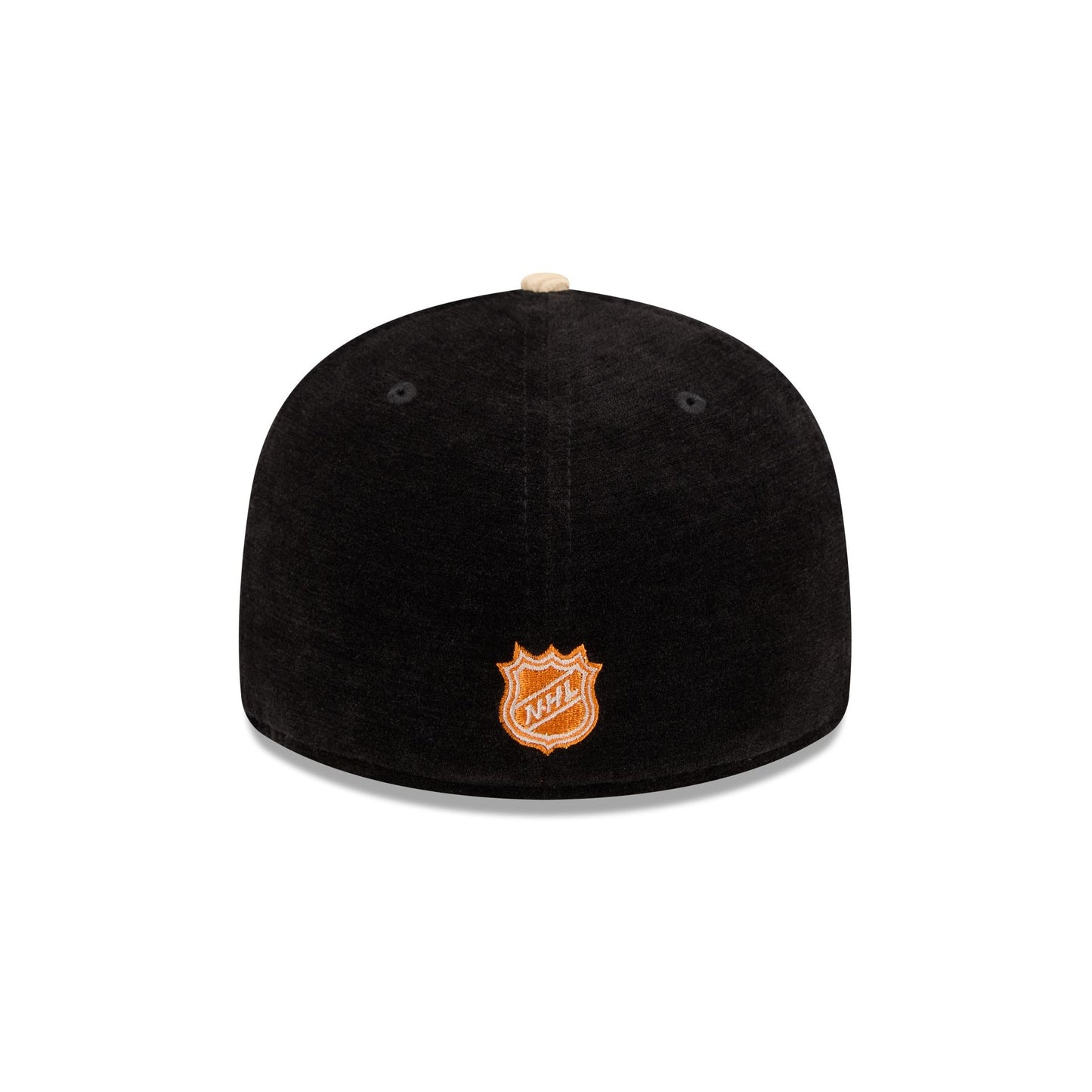 The Anaheim Ducks Fall Velvet Low Profile 59FIFTY Fitted Cap features an embroidered Ducks fall gradient logo at the front panels against a velvet fabrication throughout. Additional details include an antique brass leather stitch down city plate at the right-wear side, a matching NHL Shield logo at the rear, and a green undervisor.