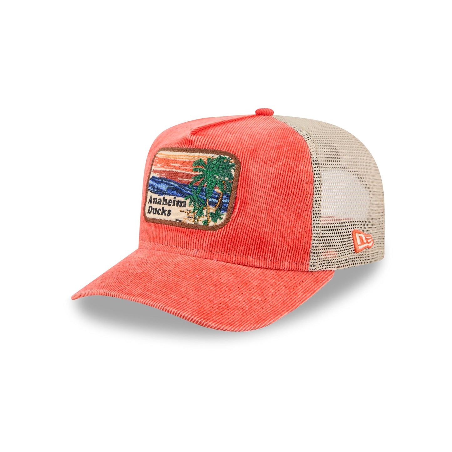 The Anaheim Ducks Vintage Landscape 9FIFTY A-Frame Trucker features an embroidered Ducks Vintage Landscape patch at the front panels with a team logo at the right-wear side. Additional details include an adjustable snapback closure at the rear and a gray undervisor.