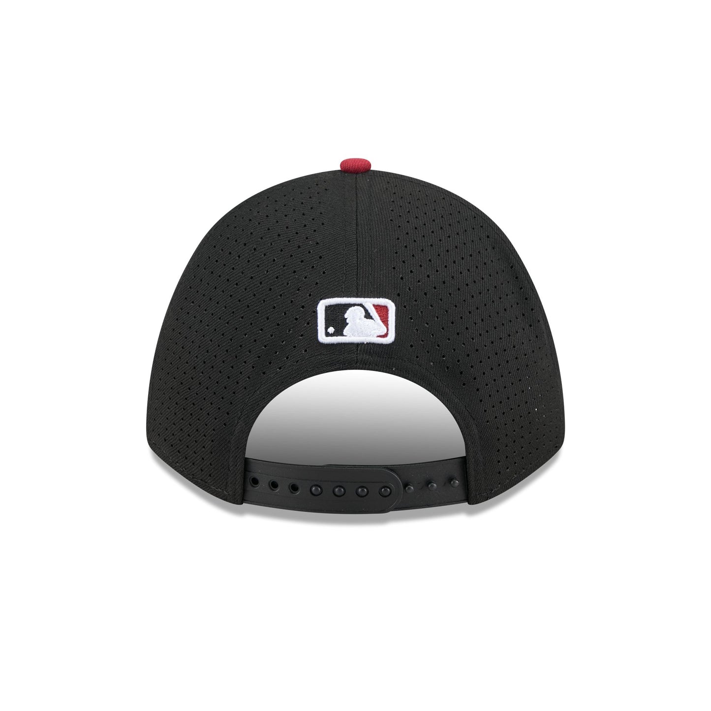 The Arizona Diamondbacks 2025 All-Star Game 9FORTY M-Crown Snapback features an embroidered Diamondbacks logo and stars at the front panels with breathable mesh fabric at the side and rear panels. Additional details include a 2025 All-Star Game patch at the right-wear side, the MLB Batterman logo above a snapback closure at the rear, and a black undervisor. The cap also features screen-printed stars on the sweatband.