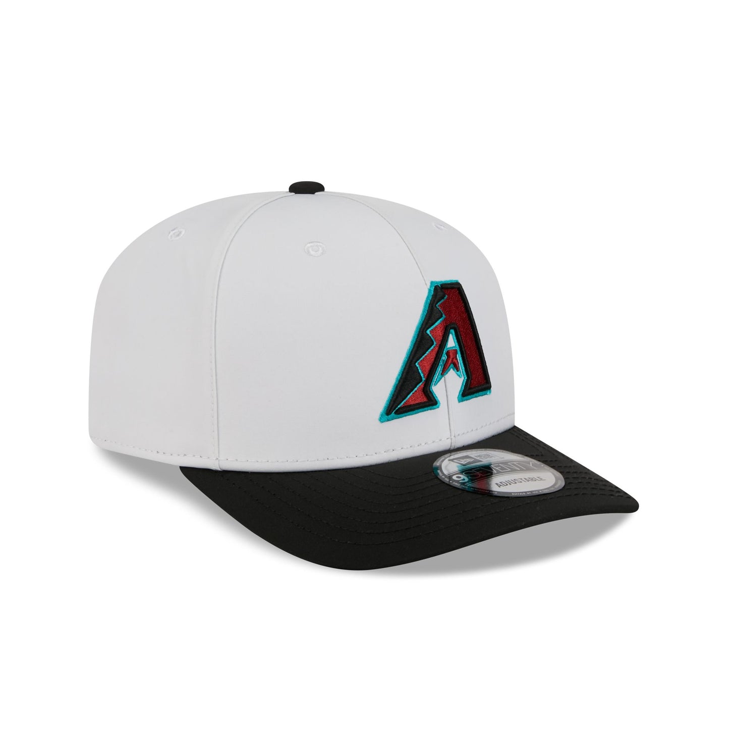 The Arizona Diamondbacks GORE-TEX White 9SEVENTY Stretch-Snap features an embroidered Diamondbacks logo at the front panels with a metallic sheen silicone New Era Flag logo and GORE-TEX logo at the left-wear side. Additional details include an adjustable snapback closure at the rear, a gray undervisor, and a polyester fabrication throughout the cap. It is waterproof, breathable, and lightweight.