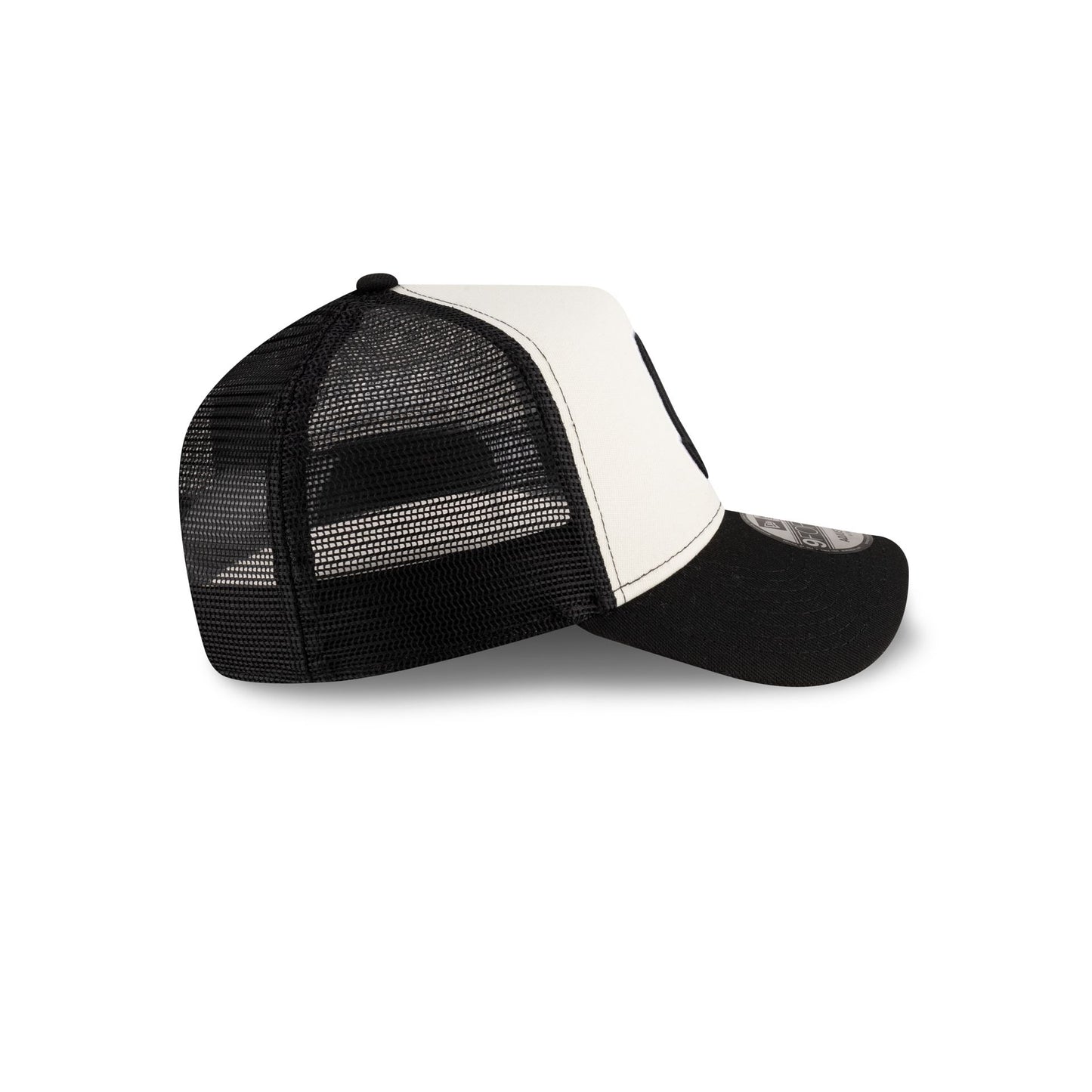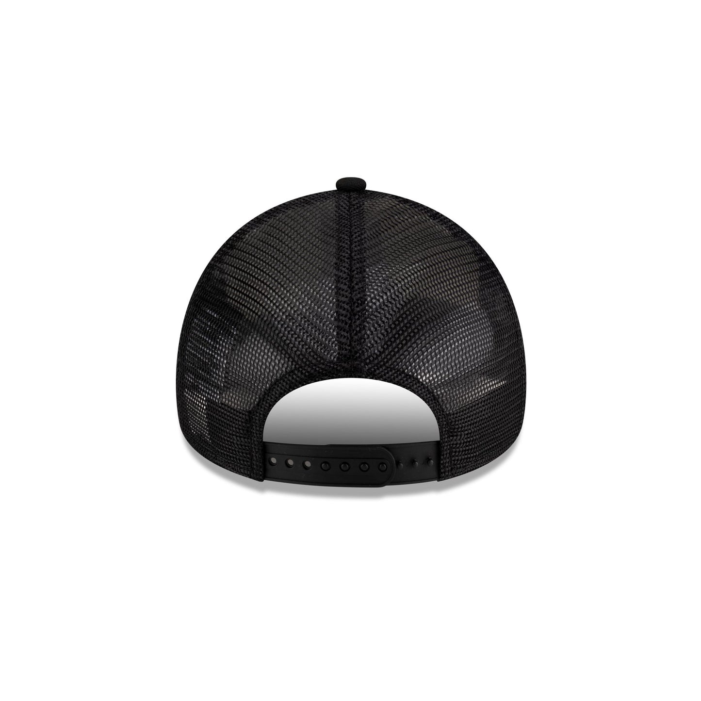 The Arizona Wildcats Chrome Black 9FORTY A-Frame Trucker features an embroidered Wildcats logo at the front panels with a snapback closure at a mesh rear.