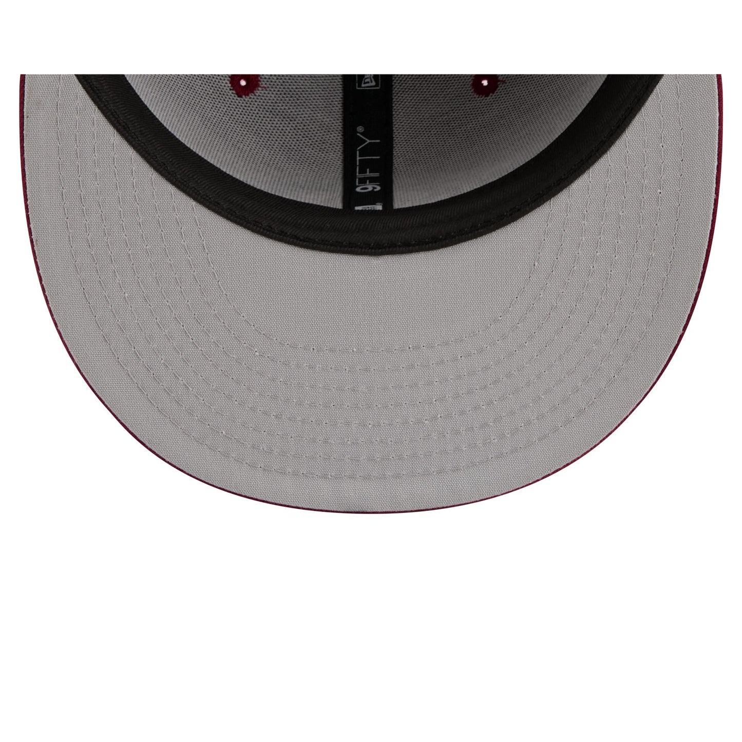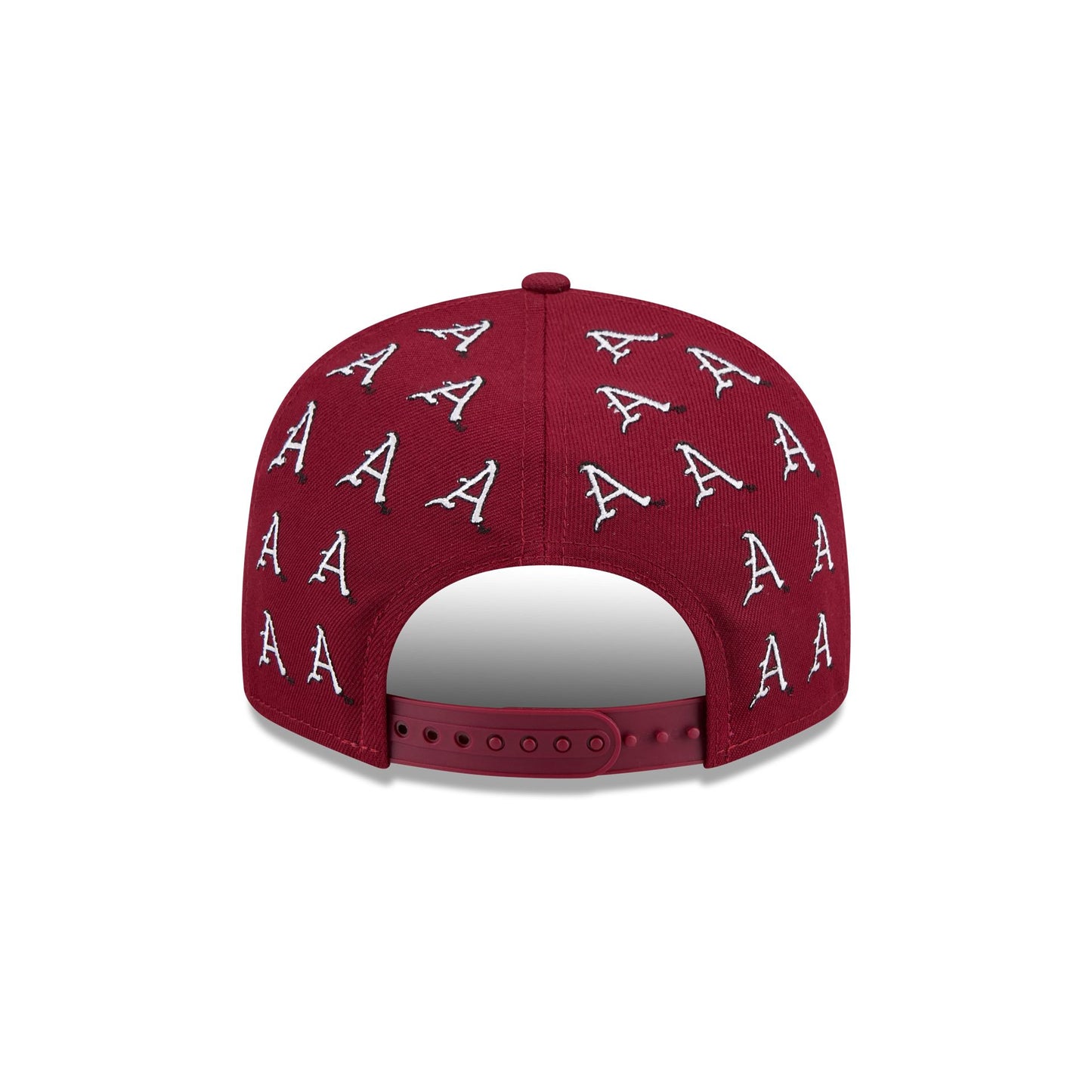 The Arkansas Razorbacks Sticker Helmet 9FIFTY Snapback features an embroidered Razorbacks logo at the front panels with embroidered team stickers the back panels. Additional details include an adjustable snapback closure at the rear and a gray undervisor.
