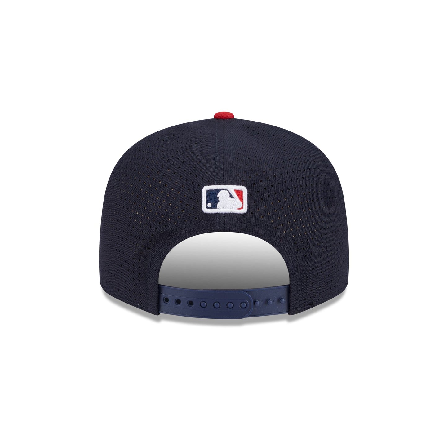 The Atlanta Braves 2025 All-Star Game Split Panel 9FIFTY Snapback features an embroidered Braves logo at the front panels against a split-crown construction with breathable mesh fabric at the side and rear panels. Additional details include stars at the top panel, a 2025 All-Star Game patch at the right-wear side, the MLB Batterman logo above a snapback closure at the rear, and a black undervisor. The cap also features screen-printed stars on the sweatband.
