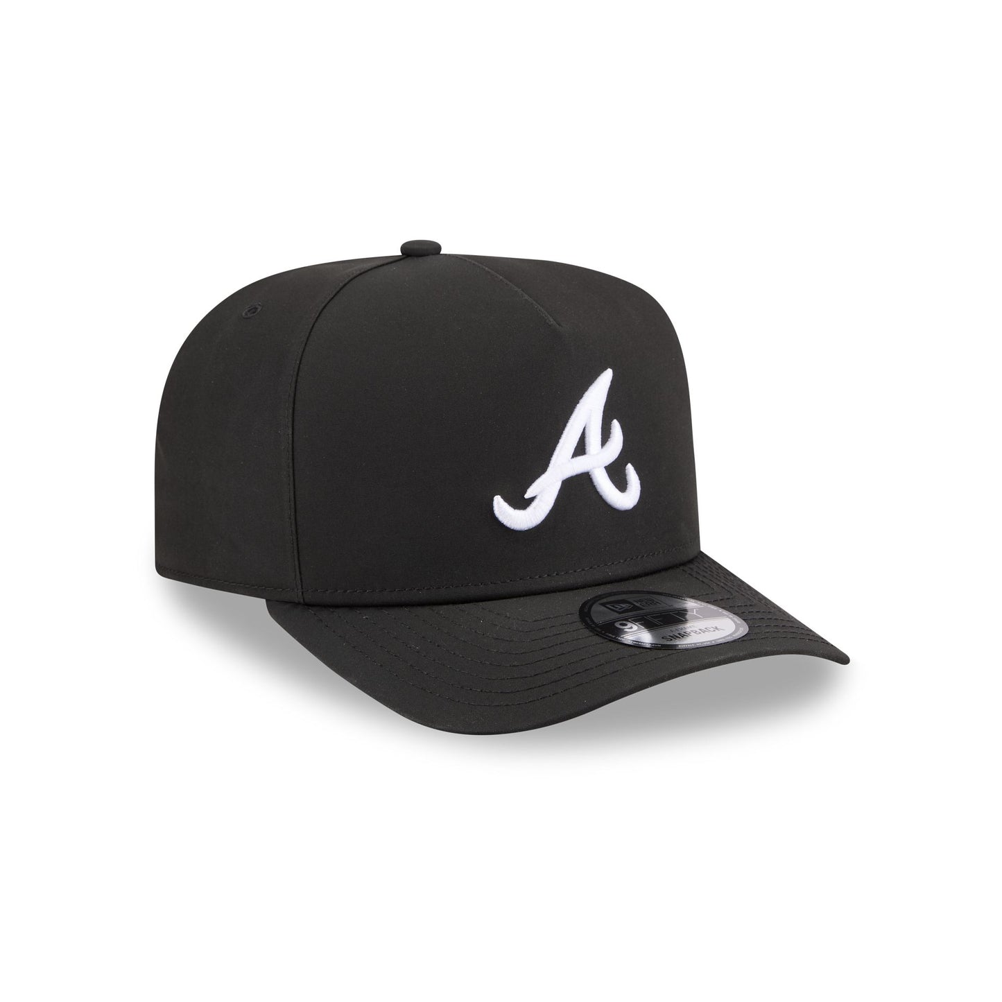 The Atlanta Braves GORE-TEX Black 9FIFTY A-Frame Snapback features an embroidered white Braves logo at the front panels with a metallic sheen silicone New Era Flag logo and GORE-TEX logo at the left-wear side. Additional details include an adjustable snapback closure at the rear, a gray undervisor, and a polyester fabrication throughout the cap. It is waterproof, breathable, and lightweight.