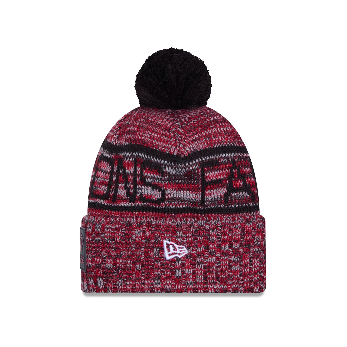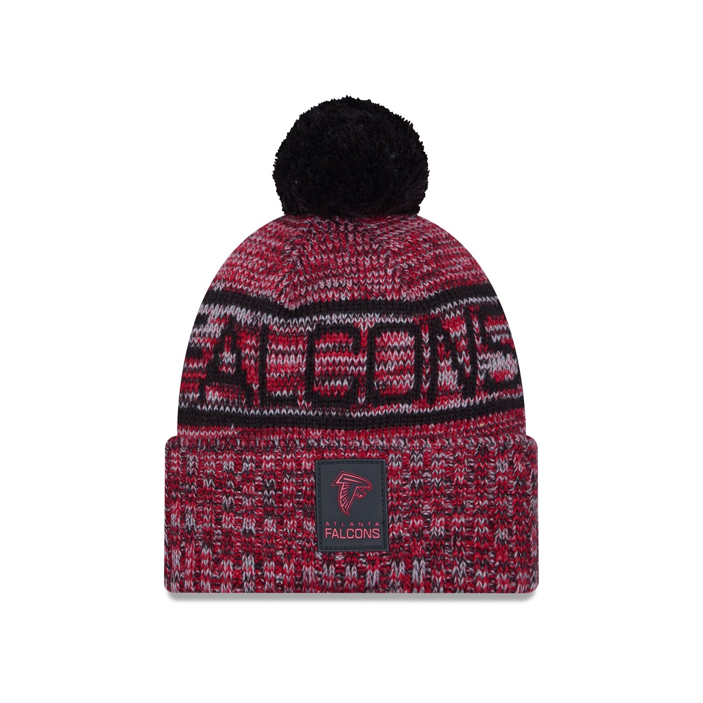 The Atlanta Falcons 2025 Sideline Cold Weather Pom Knit Hat features a sewn-down silicone Falcons logo patch at the front cuff with a matching Official NFL Shield logo at the rear. Additional details include a team wordmark across the crown, a one-time removeable pom, and a fleece lining.