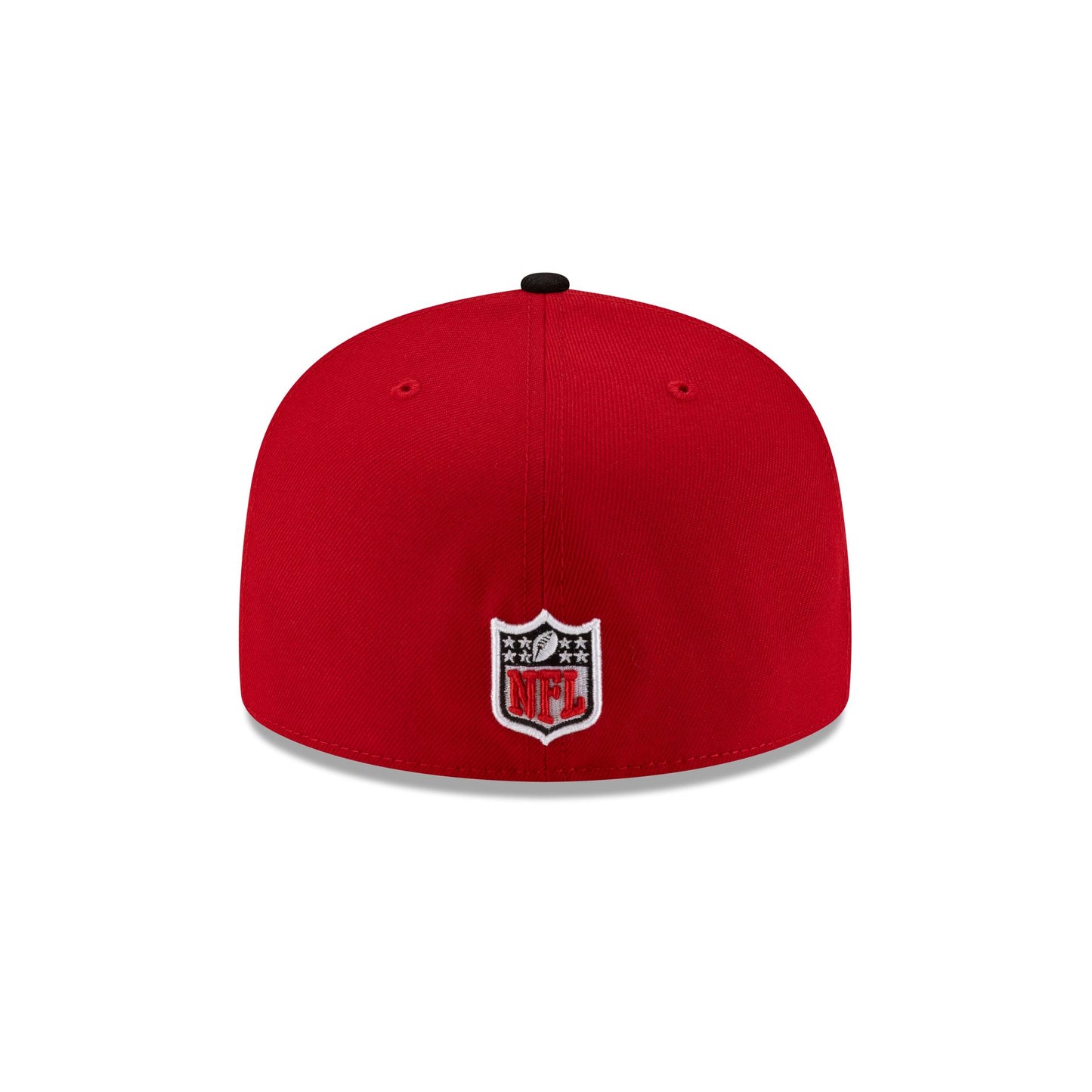 The Atlanta Falcons Mascot 59FIFTY Fitted Cap features an embroidered Falcons mascot at the front panels with a matching NFL Shield at the rear, a team logo at the right-wear side, and a gray undervisor.