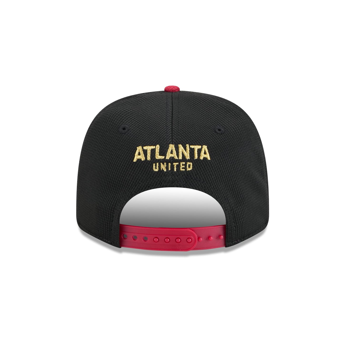 The Atlanta United FC 2025 Jersey Hook 9SEVENTY Stretch-Snap features an embroidered Atlanta United logo at the front panels with a side patch at the right-wear side. Additional details include a team wordmark above a snapback closure at the rear.