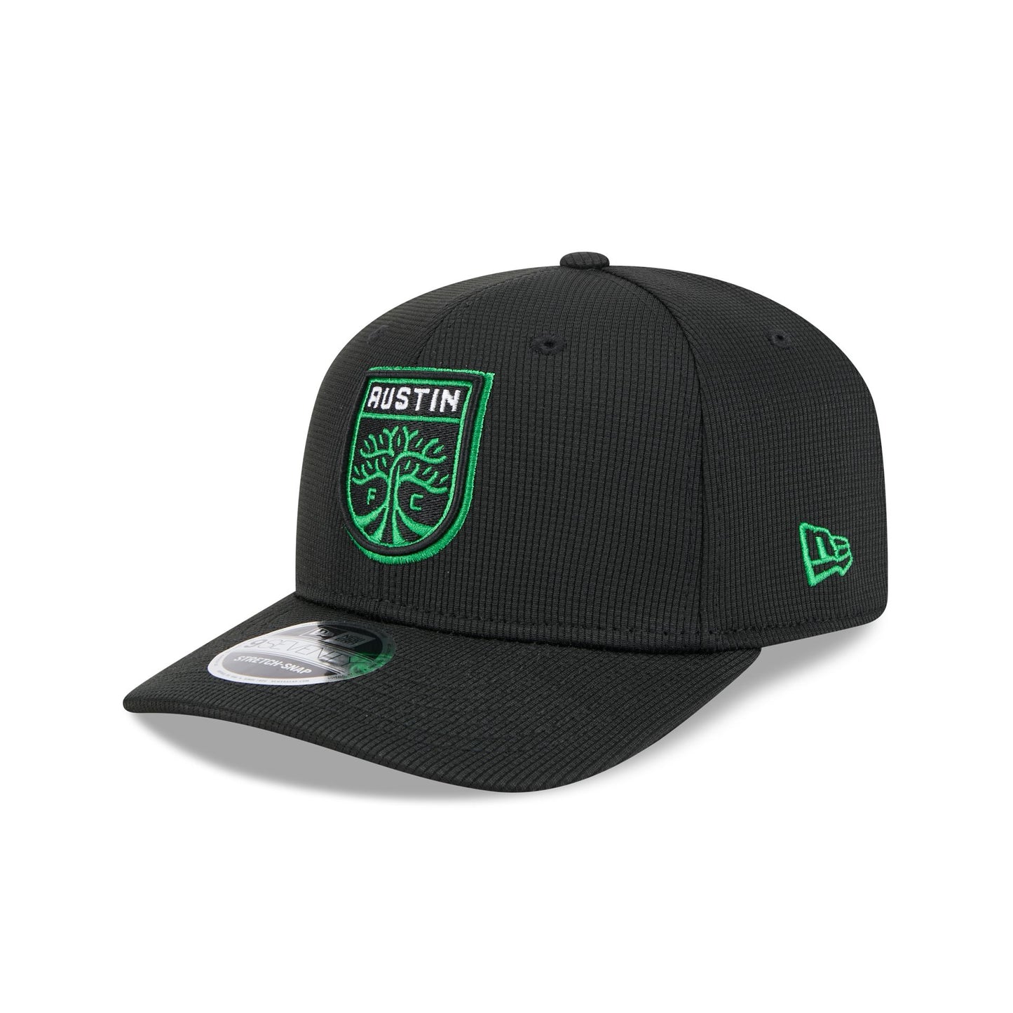 The Austin FC 2025 Jersey Hook 9SEVENTY Stretch-Snap features an embroidered Austin logo at the front panels with a side patch at the right-wear side. Additional details include a wordmark above a snapback closure at the rear.
