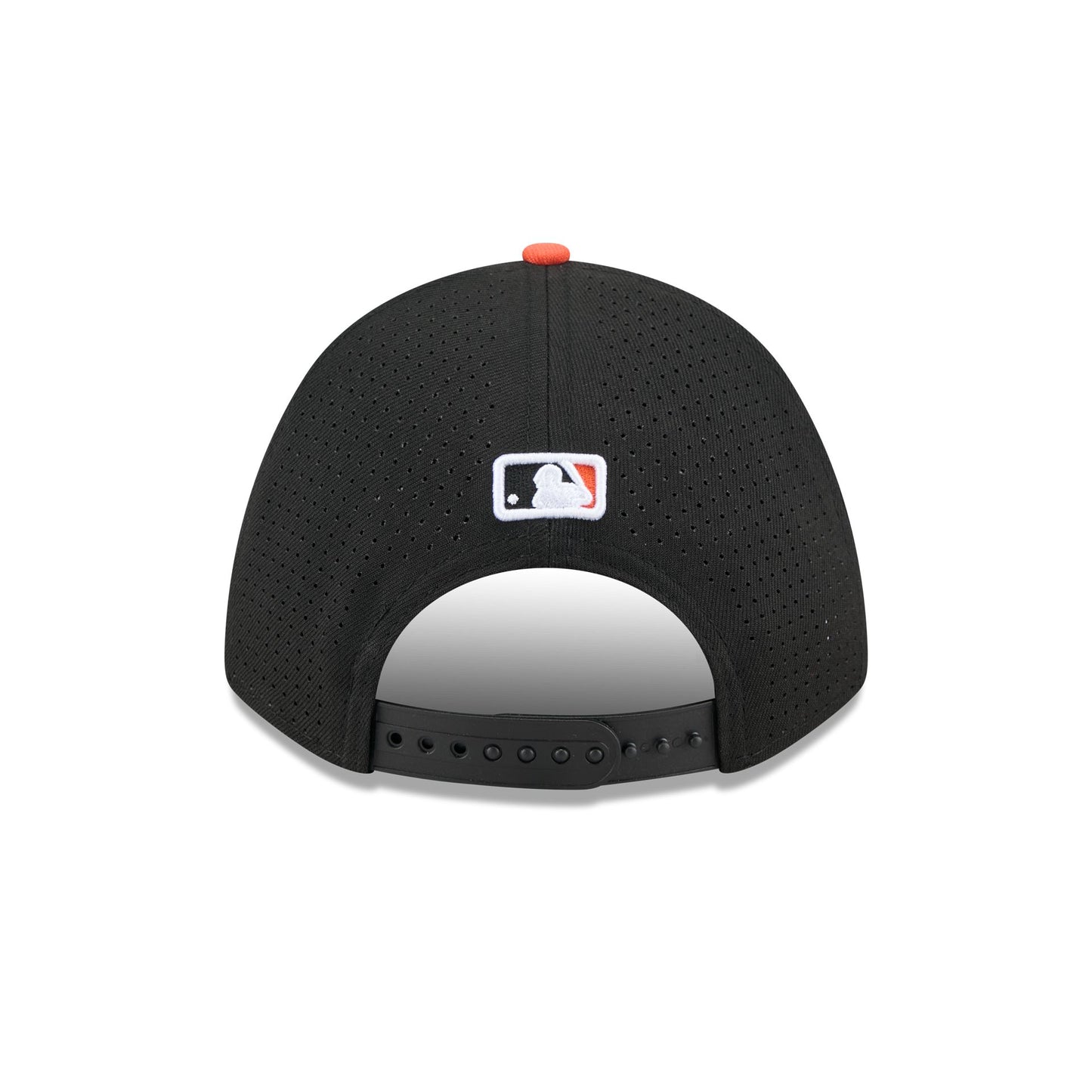 The Baltimore Orioles 2025 All-Star Game 9FORTY M-Crown Snapback features an embroidered Orioles logo and stars at the front panels with breathable mesh fabric at the side and rear panels. Additional details include a 2025 All-Star Game patch at the right-wear side, the MLB Batterman logo above a snapback closure at the rear, and a black undervisor. The cap also features screen-printed stars on the sweatband.
