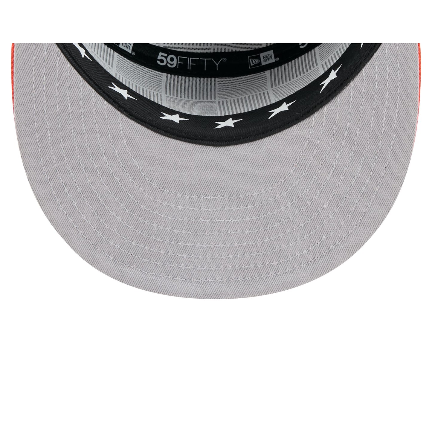The Baltimore Orioles 2025 All-Star Game Split Panel 59FIFTY Fitted Cap features an embroidered Orioles logo at the front panels against a split-crown construction with breathable mesh fabric at the side and rear panels. Additional details include stars at the top panel, a 2025 All-Star Game patch at the right-wear side, the MLB Batterman logo at the rear, and a gray undervisor. The cap also features screen-printed stars on the sweatband.