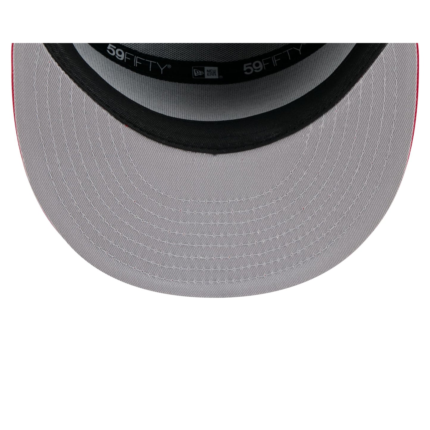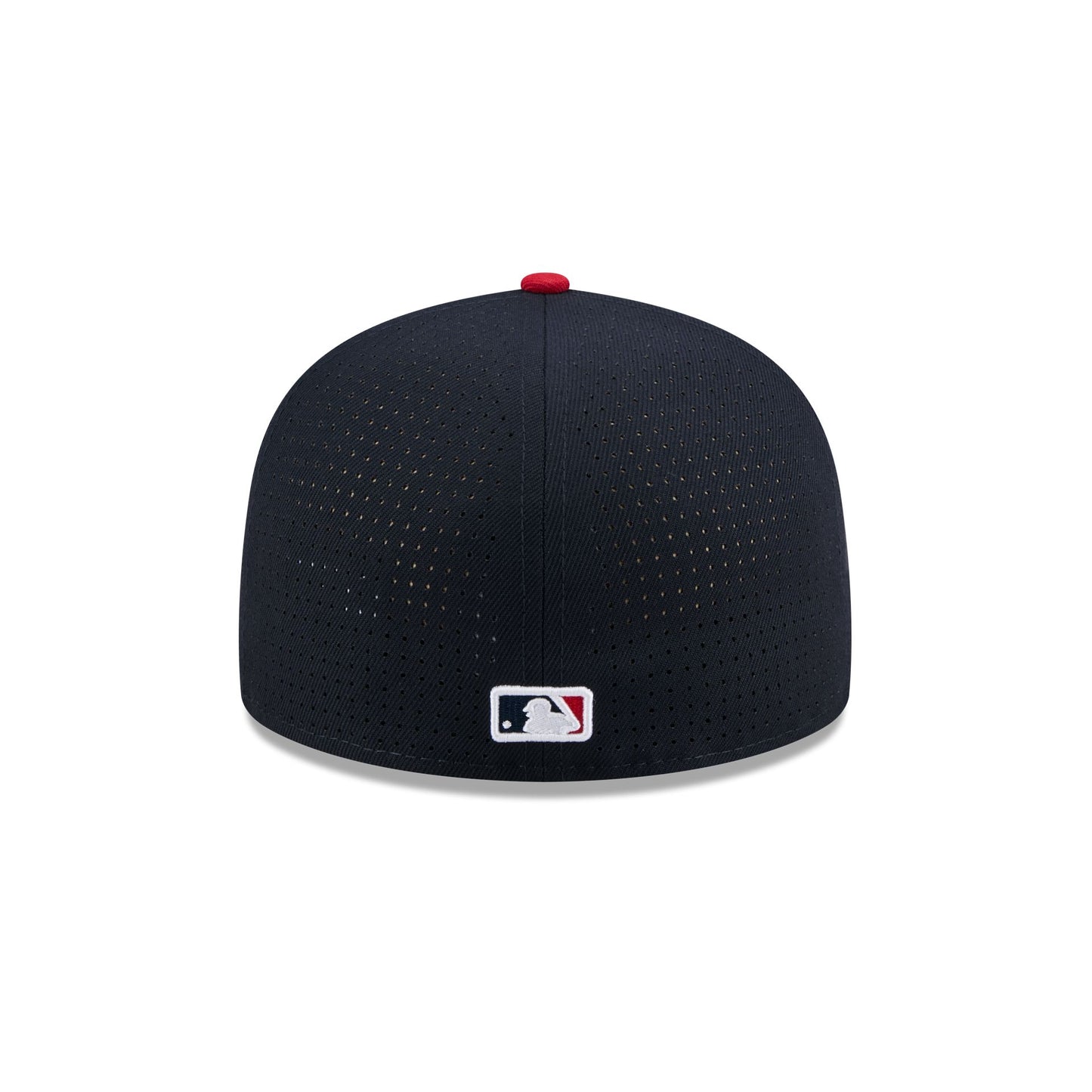 The Baltimore Orioles 2025 All-Star Game Workout Split Panel 59FIFTY Fitted Cap features an embroidered Orioles logo at the front panels against a split-crown construction with breathable mesh fabric at the side and rear panels. Additional details include stars at the top panel, a 2025 All-Star Game patch at the right-wear side, the MLB Batterman logo at the rear, and a gray undervisor.