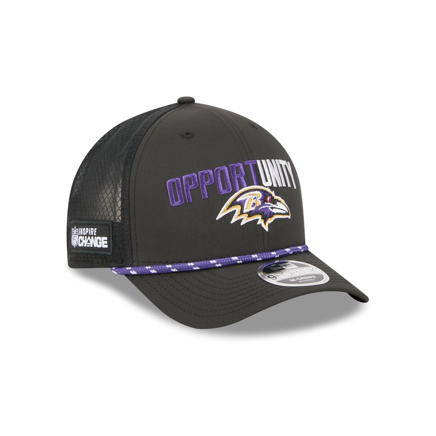 The Baltimore Ravens 2025 Inspire Change 9FORTY M-Crown Snapback features an embroidered Ravens logo and matching "Opportunity" wordmark at the front panels with an NFL Inspire Change patch at the right-wear side. Additional details include a rope at the visor and an adjustable snapback closure at the rear.