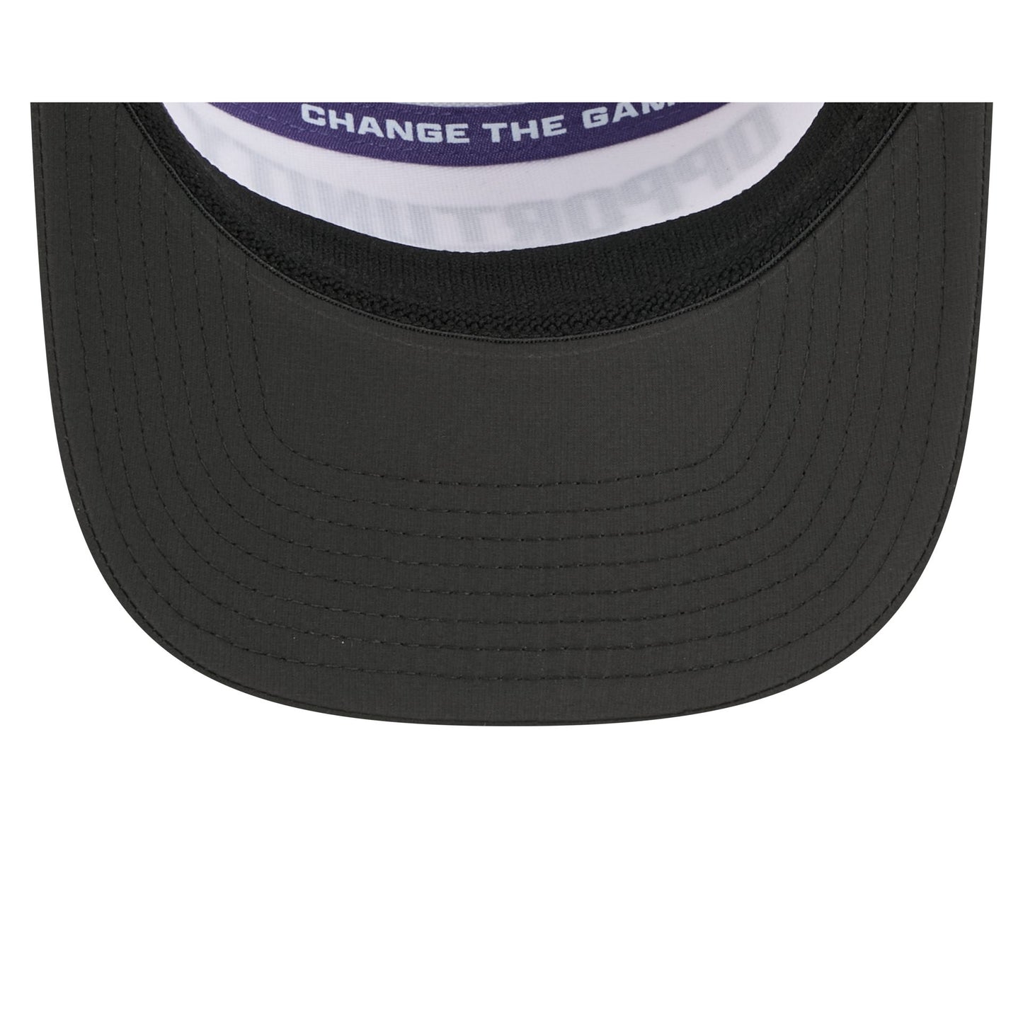 The Baltimore Ravens 2025 Inspire Change Split Panel 9SEVENTY Trucker features an embroidered Ravens logo and matching "Opportunity" wordmark at the front panels with an NFL Inspire Change patch at the right-wear side. Additional details include a rope at the visor and an adjustable stretch-snap closure at the rear. The cap has a split crown construction.