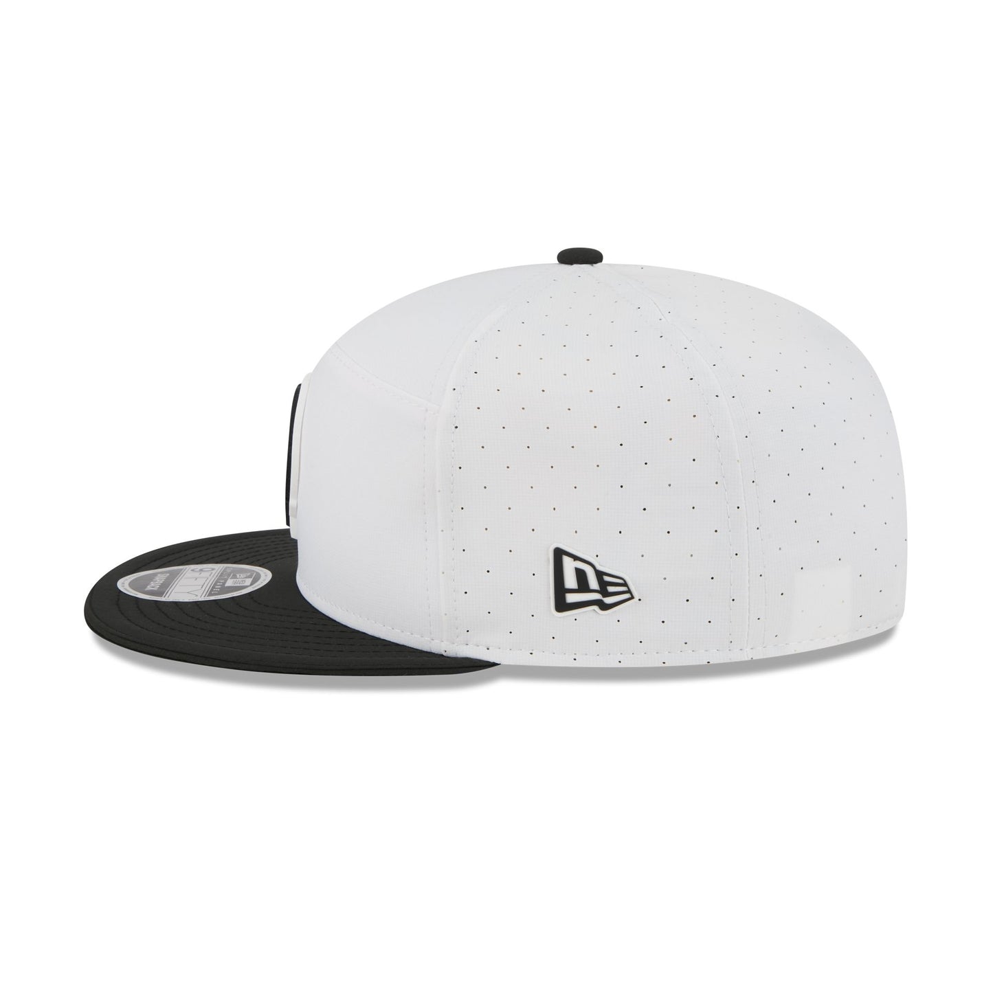 The Baltimore Ravens 2025 Training Split Panel 9FIFTY Snapback features a silicone Ravens patch at the front panel with team color stripes at the front of a black visor. Additional details include a silicone NFL Shield patch on a woven foldover tab above a snapback closure at the rear.