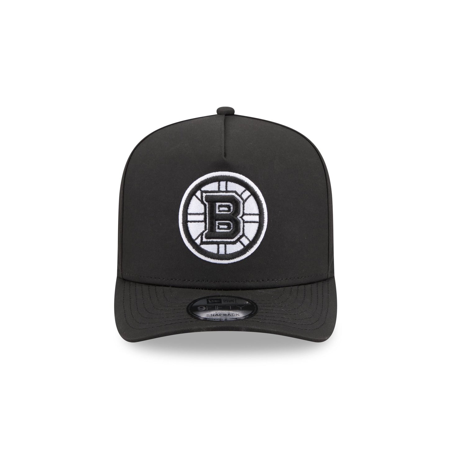 The Boston Bruins GORE-TEX Black 9FIFTY A-Frame Snapback features an embroidered white Bruins logo at the front panels with a metallic sheen silicone New Era Flag logo and GORE-TEX logo at the left-wear side. Additional details include an adjustable snapback closure at the rear, a gray undervisor, and a polyester fabrication throughout the cap. It is waterproof, breathable, and lightweight.