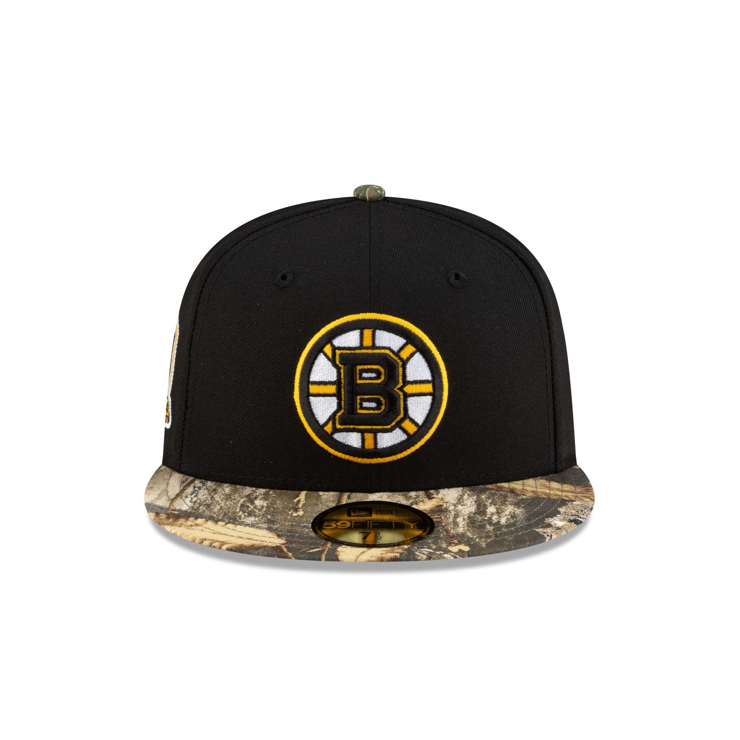 The Boston Bruins Realtree Visor 59FIFTY Fitted Cap features an embroidered Bruins logo at the front panels with a matching NHL Shield at the rear. Additional details include a 90th Anniversary patch at the right-wear side, a Realtree visor and a gray undervisor.