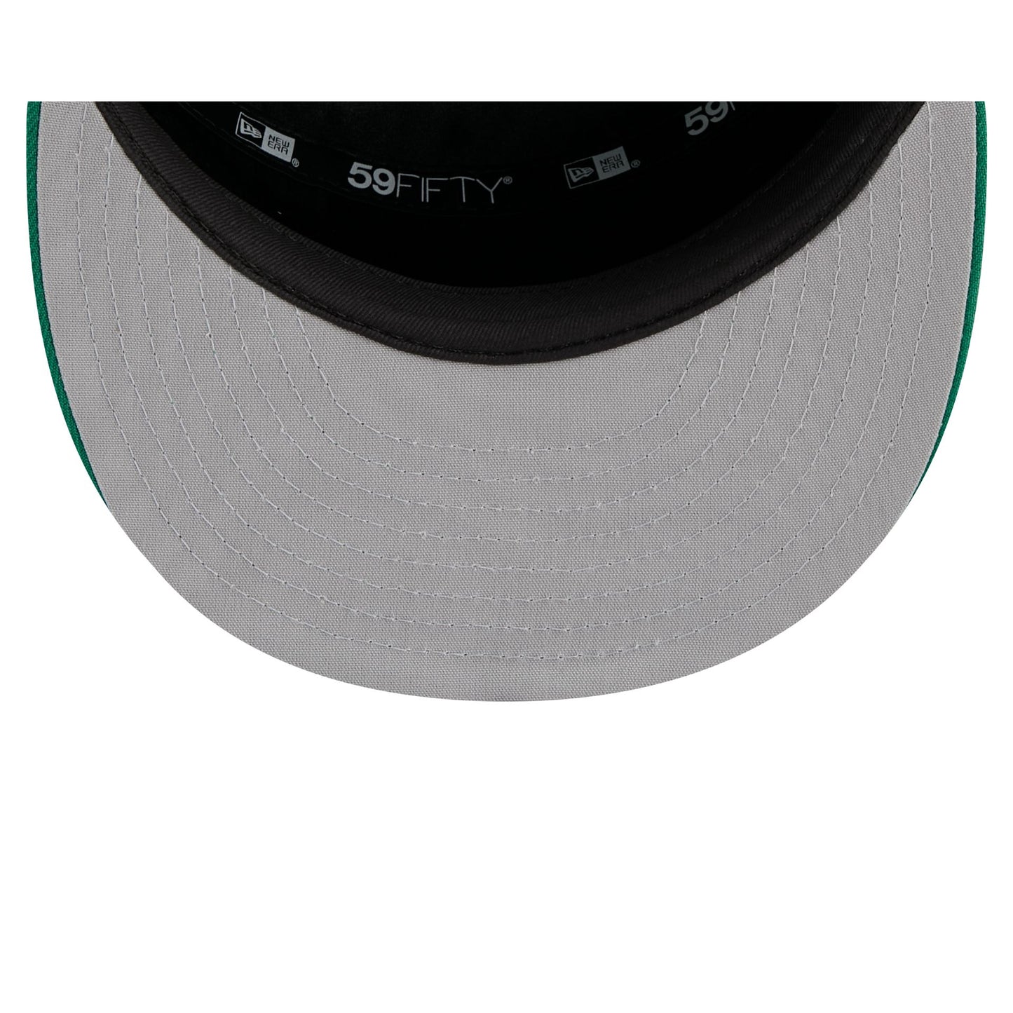 The Boston Celtics 2025 Tip-Off Split Panel 59FIFTY Fitted Cap features an embroidered Celtics logo at the front panels against a pinstripe jersey fabrication with the NBA Logoman at the right-wear side. Additional details include a team wordmark at the rear and a gray undervisor.