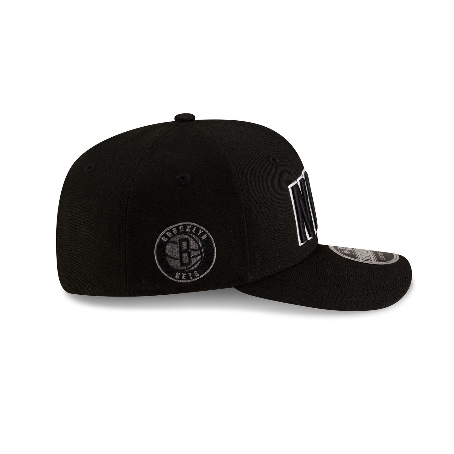 The Brooklyn Nets 2025 Statement Edition 9SEVENTY Stretch-Snap features an embroidered Nets Statement Edition logo at the front panels with a logo at the right-wear side. Additional details include the NBA Logoman above an adjustable stretch-snap closure at the rear and a gray undervisor.