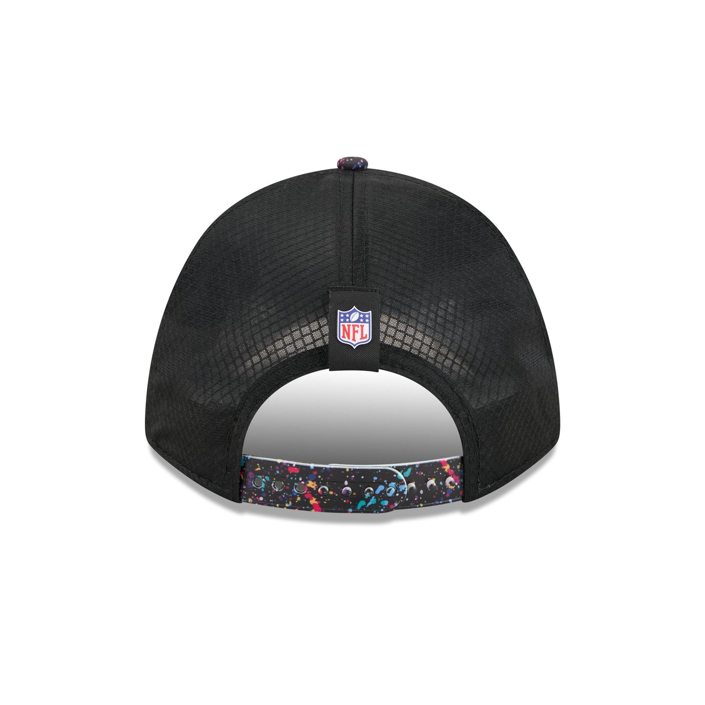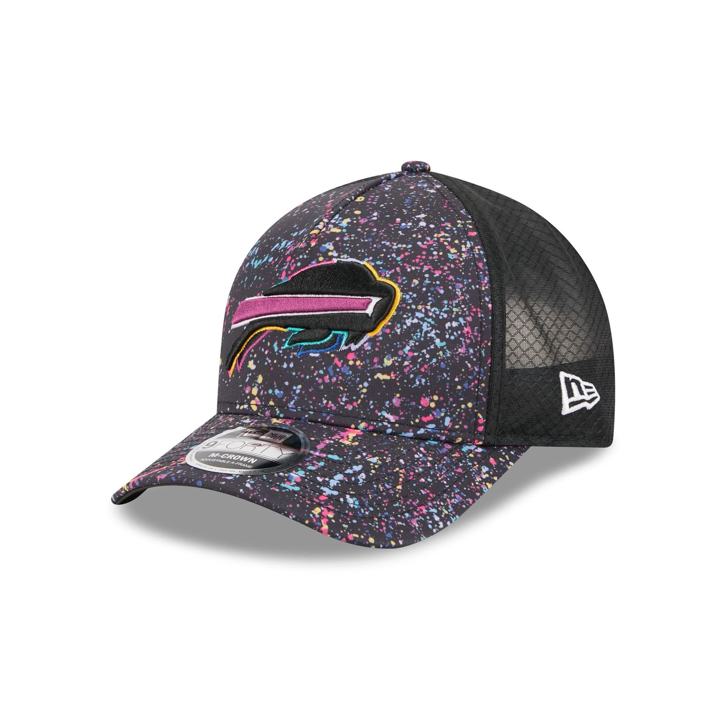 The Buffalo Bills 2025 Crucial Catch 9FORTY M-Crown A-Frame Trucker features an embroidered Bills logo at the front paint splatter panels with a woven NFL Shield tag above a snapback closure at the rear. Additional details include a Crucial Catch Intercept Cancer patch at the right-wear side with performance mesh rear panels and a black undervisor.