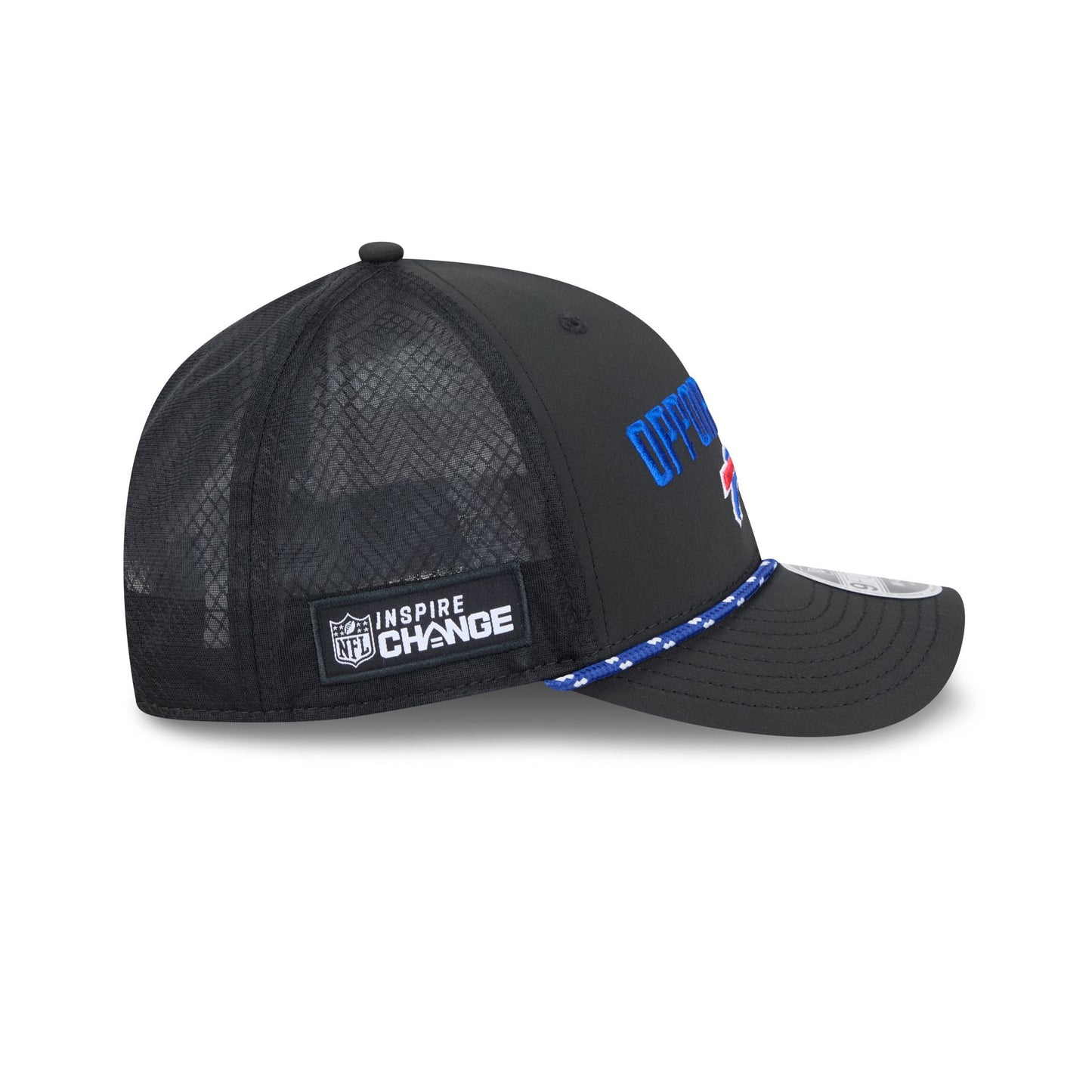 The Buffalo Bills 2025 Inspire Change 9FORTY M-Crown Snapback features an embroidered Bills logo and matching "Opportunity" wordmark at the front panels with an NFL Inspire Change patch at the right-wear side. Additional details include a rope at the visor and an adjustable snapback closure at the rear.