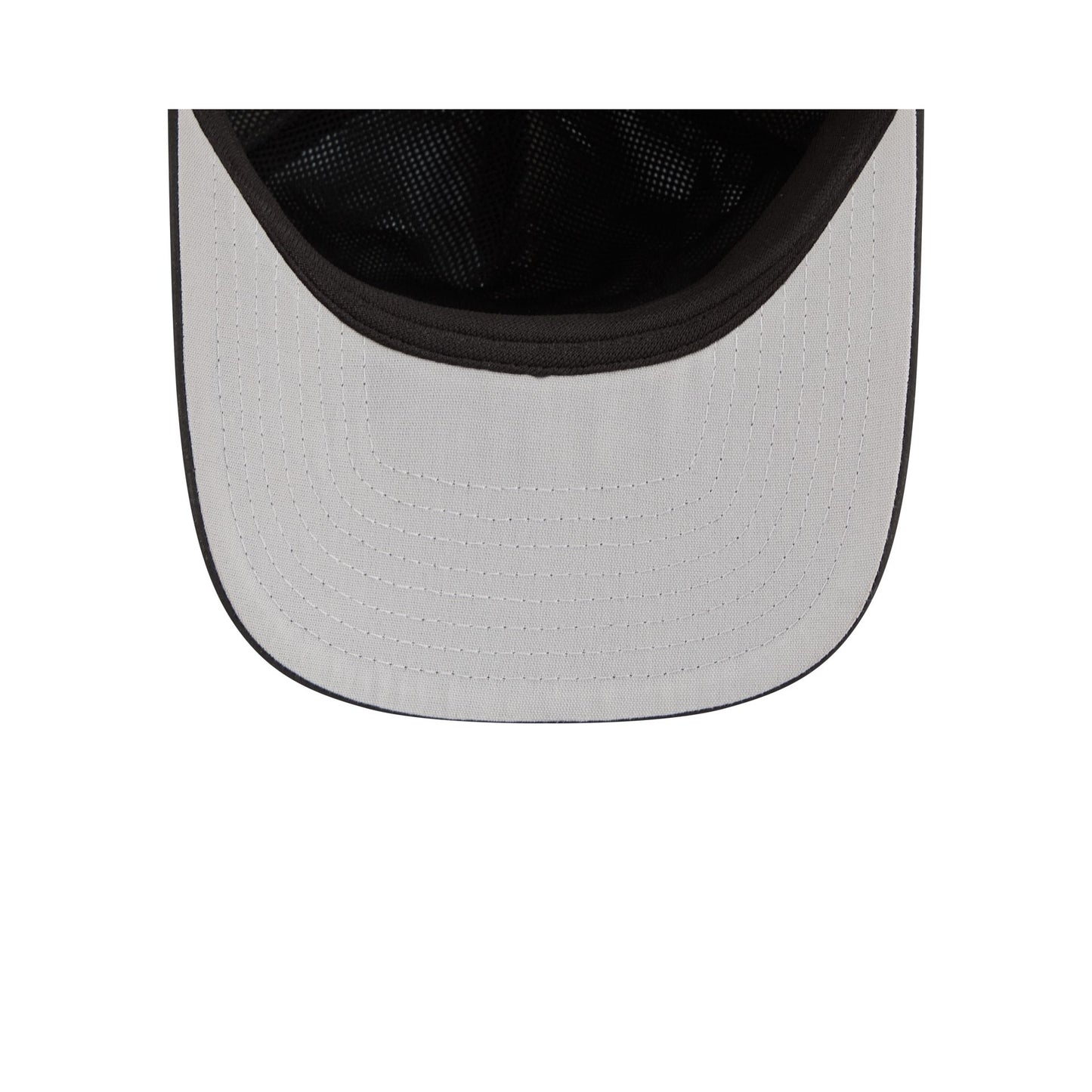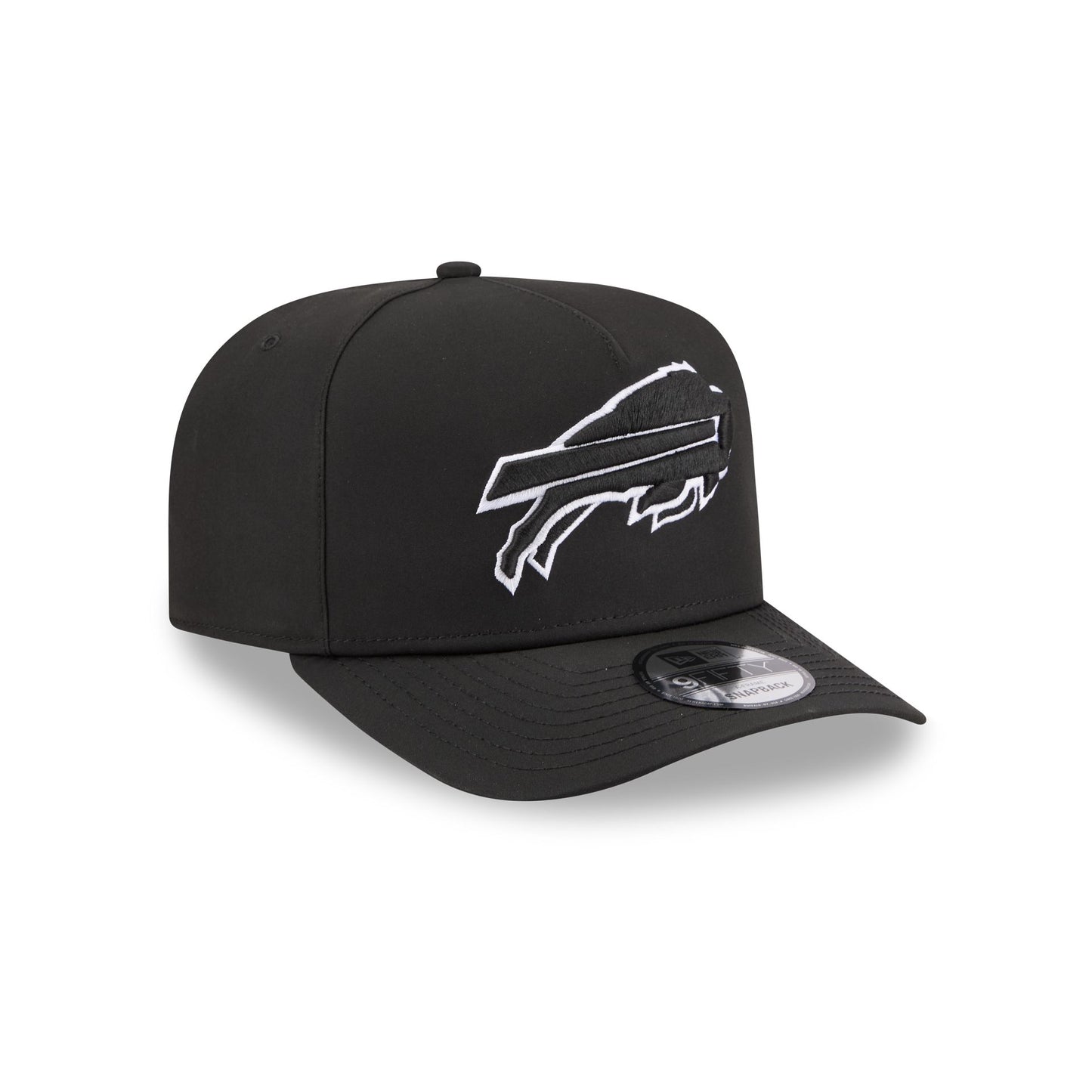 The Buffalo Bills GORE-TEX Black 9FIFTY A-Frame Snapback features an embroidered white Bills logo at the front panels with a metallic sheen silicone New Era Flag logo and GORE-TEX logo at the left-wear side. Additional details include an adjustable snapback closure at the rear, a gray undervisor, and a polyester fabrication throughout the cap. It is waterproof, breathable, and lightweight.