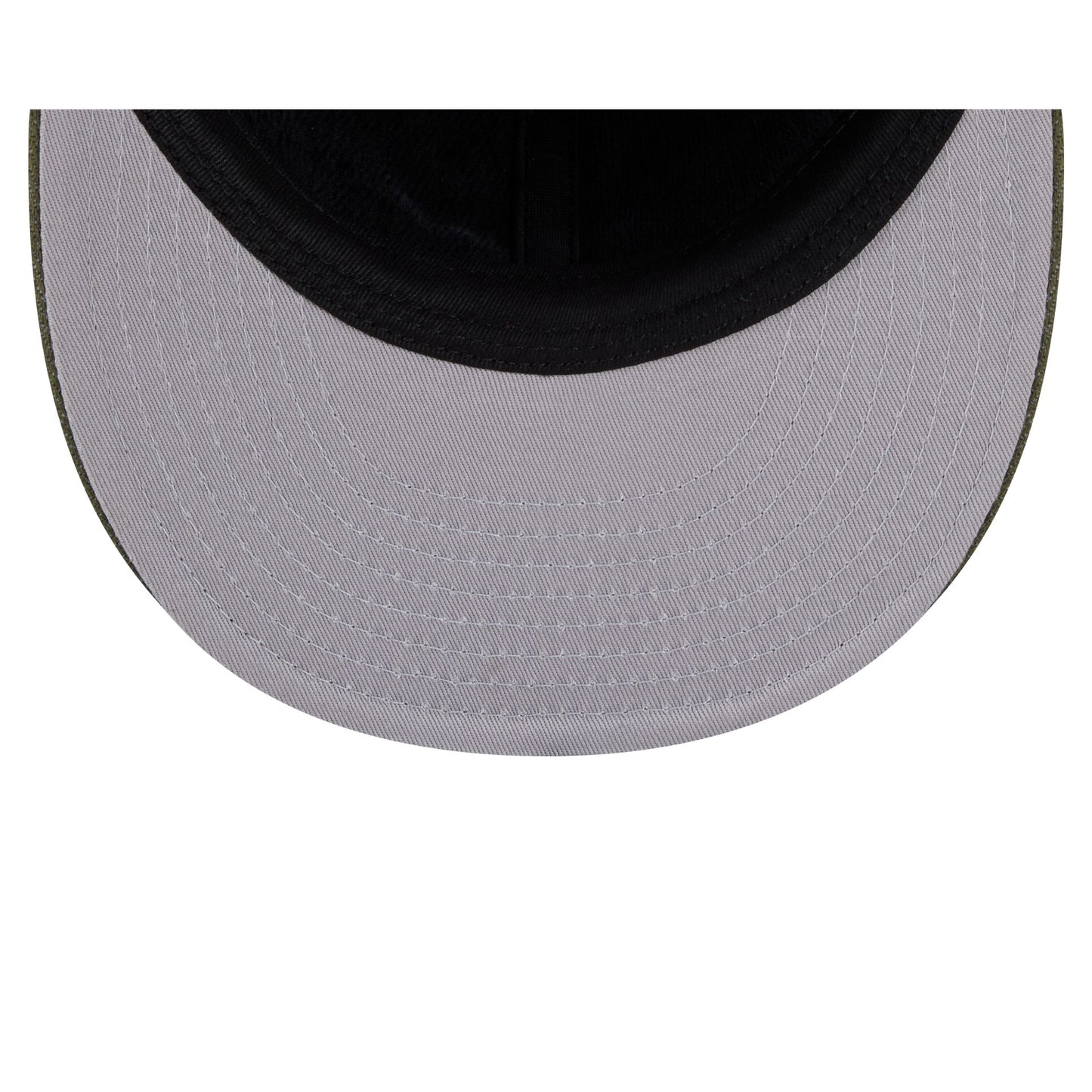 The Buffalo Bills Three Looms Cotton Twill Camo Retro Crown Dog Ear 59FIFTY Fitted features an embroidered Bills logo at the front panels with a matching NFL Shield at the rear. Additional details include fleece camo lined ear covers with a snap button closure and a gray undervisor.