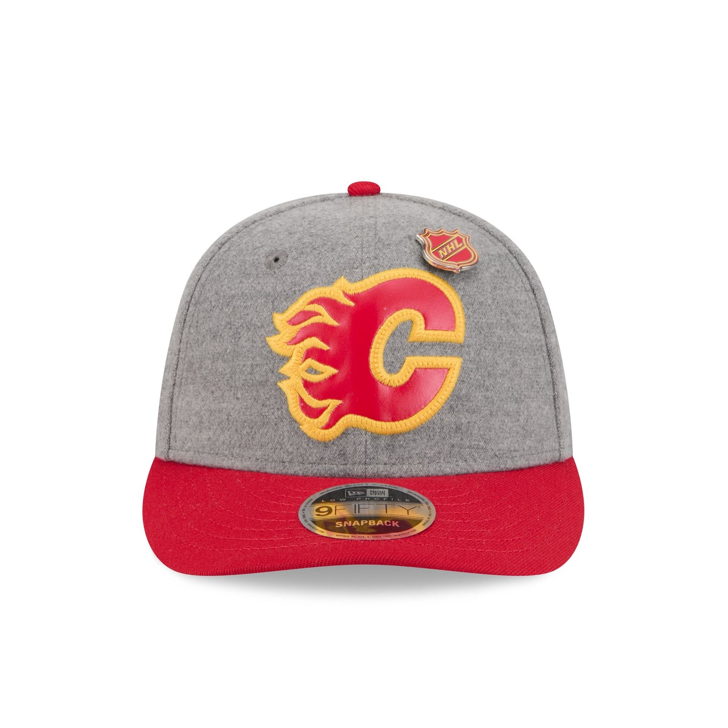 The Calgary Flames Heather Gray Wool Low Profile 9FIFTY snapback features a faux leather applique Flames logo at the front panels against a wool fabrication throughout the cap. Additional details include a conference patch at the right-wear side, an NHL pin at the front, and a script wordmark above an adjustable snapback closure at the rear.