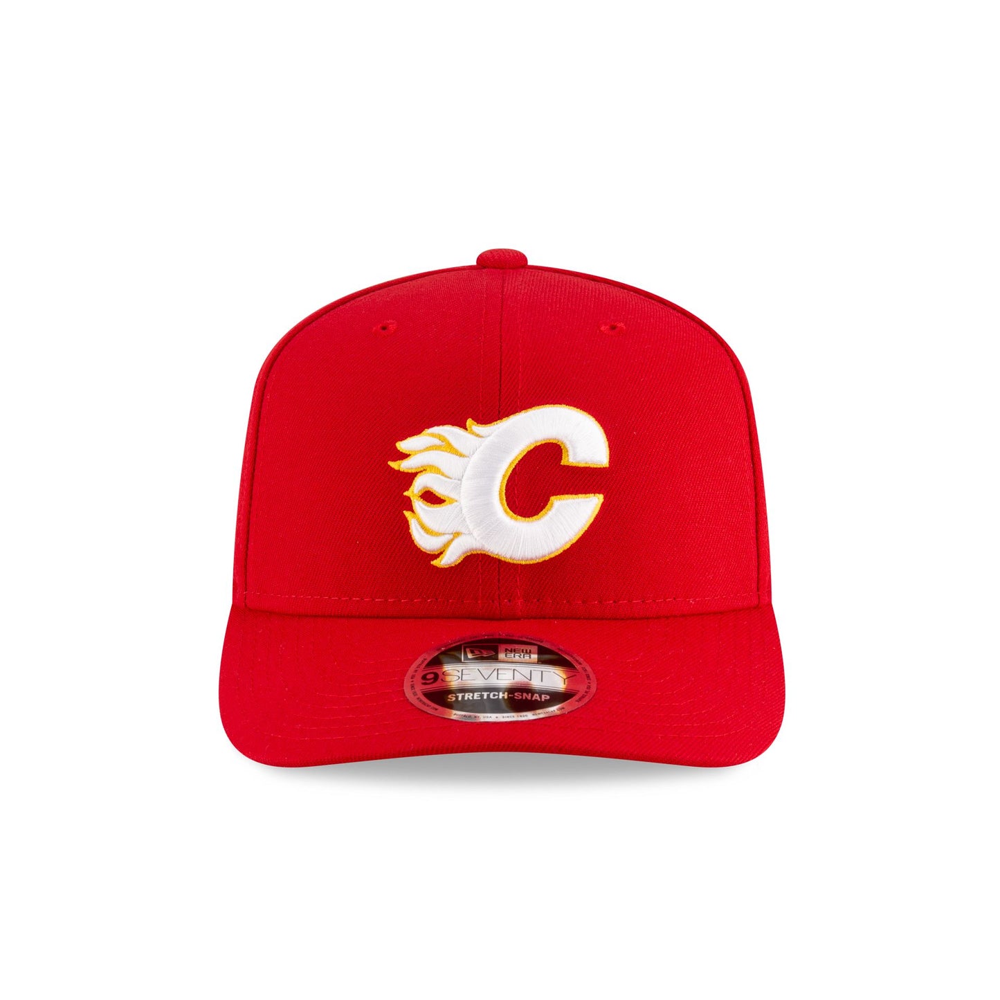 The Calgary Flames Team 9SEVENTY Stretch-Snap Cap features an embroidered Flames logo at the front panels with the NHL Shield logo above an adjustable stretch-snap closure at the rear and a gray undervisor.