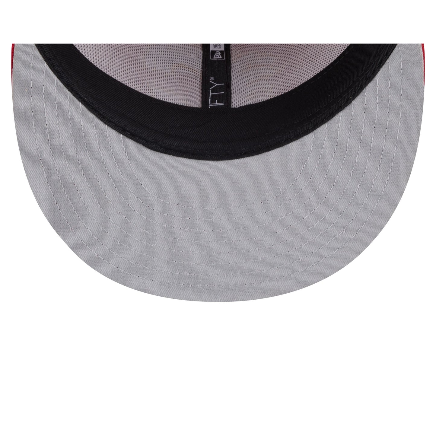 The Calgary Flames Team Tag 9FIFTY Trucker features an embroidered Flames logo at the front panels with a team tag on an snapback closure at a mesh rear and a gray undervisor.