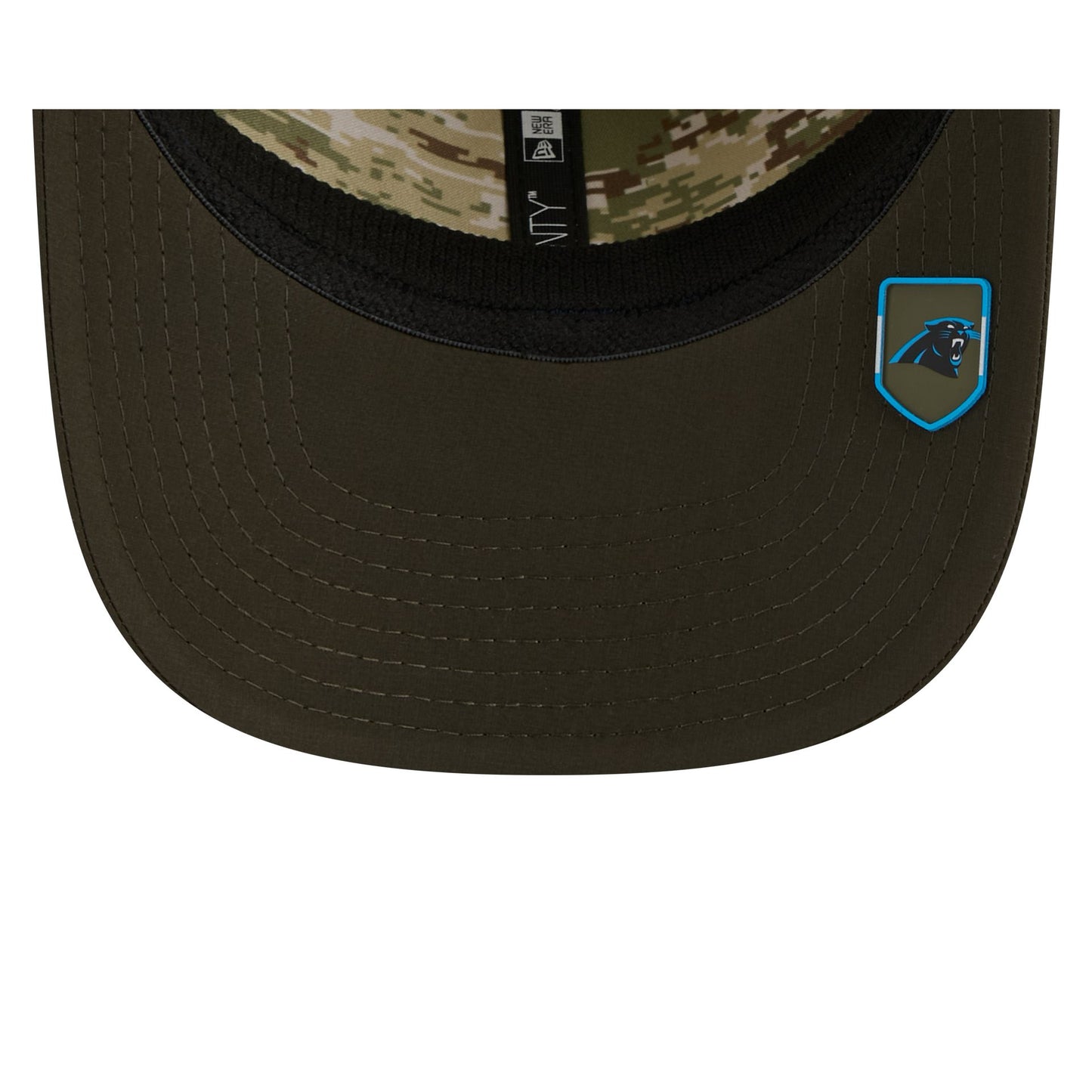 The Carolina Panthers 2025 Salute to Service 9SEVENTY Trucker features an embroidered Panthers logo at the front panels with the official NFL Salute to Service patch above a snapback closure at the rear. Additional details include an American flag patch at the right-wear side with a silicone team logo patch at a dark green undervisor and a digi camo interior fabrication.