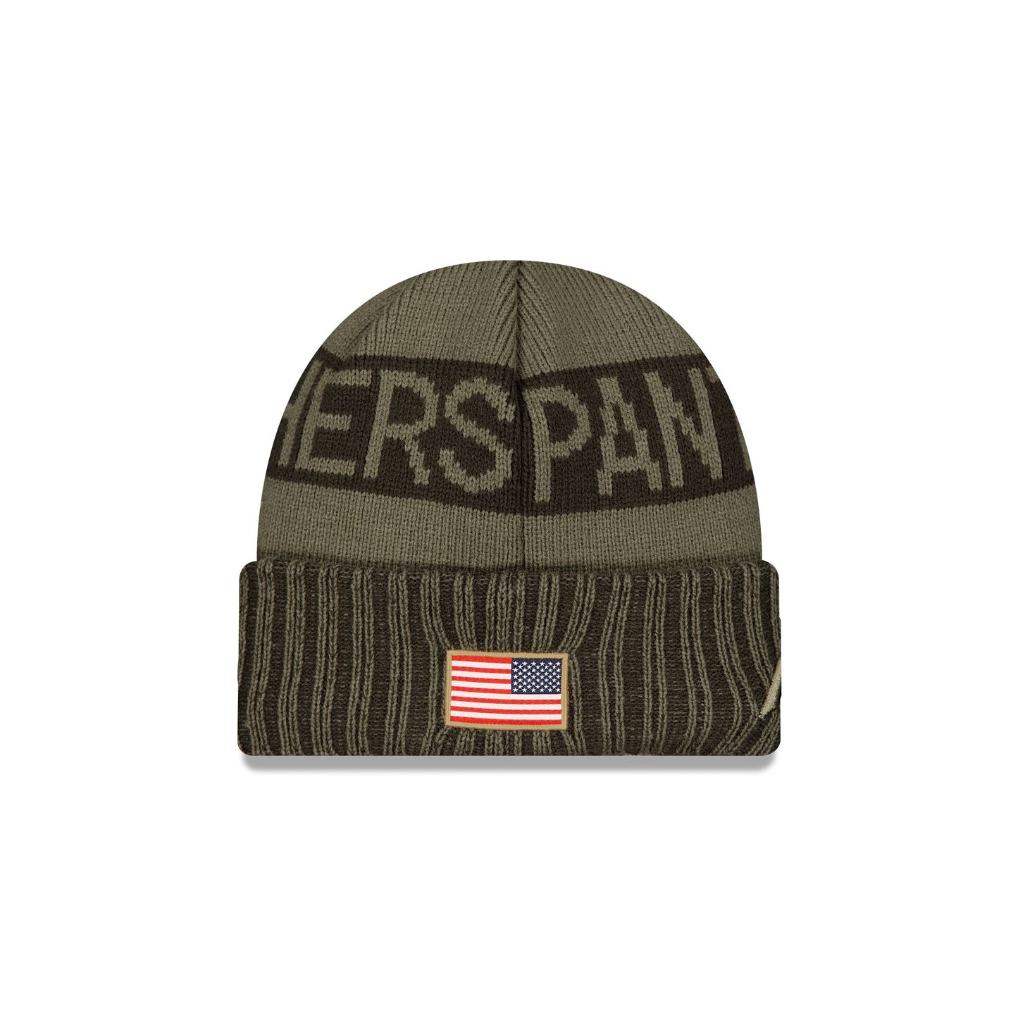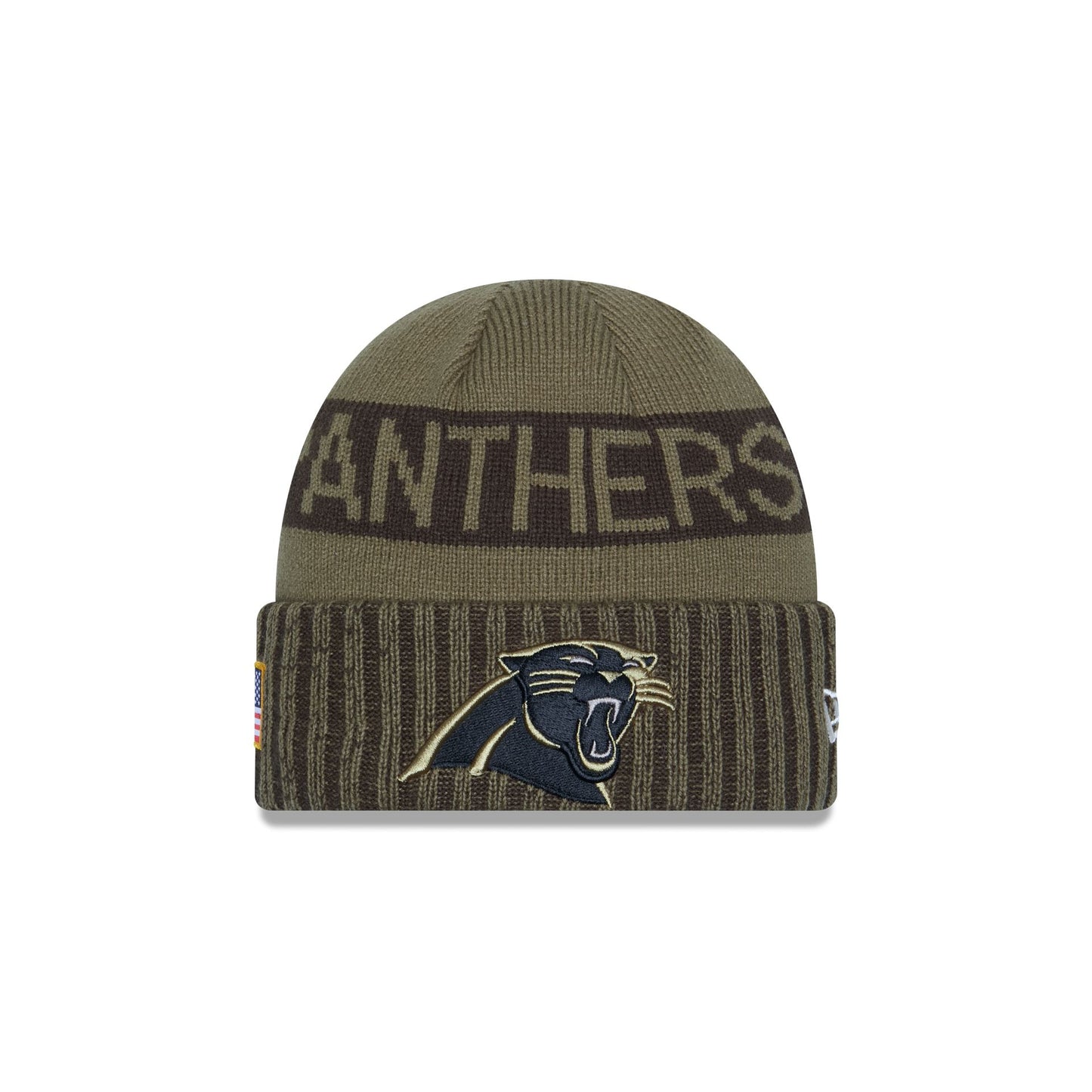 The Carolina Panthers 2025 Salute to Service Cuff Knit features an embroidered Panthers logo at the front with a team wordmark at the crown, an American flag patch at the right-wear side, and the official NFL Salute to Service patch at the rear.