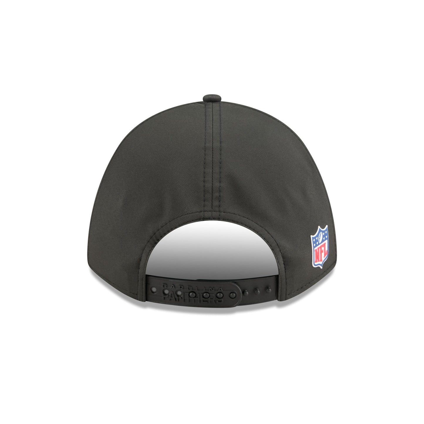 The Carolina Panthers 2025 Sideline Cold Weather Steel Clouds 9FORTY M-Crown Snapback features a sewn-down silicone Panthers logo patch at the front panels with a water-repellent quill tech fabrication throughout and a quick-dry cushioned sweatband to absorb moisture. Additional details include the Official NFL Shield logo to the right of a soft silicone snapback closure at the rear. The crown has bonded seams to trap warmth and the undervisor is accented with a silicone transfer in the team’s colors.