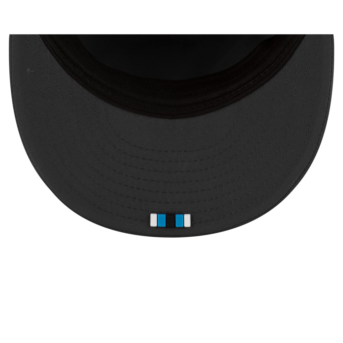 The Carolina Panthers 2025 Sideline Cold Weather Steel Clouds Retro Crown 59FIFTY A-Frame Fitted Cap features a sewn-down silicone Panthers logo patch at the front panels with the Official NFL Shield logo at the rear. The cap has a water-repellent quill tech fabrication throughout, with an insulated crown and quick-dry cushioned sweatband. The undervisor is accented with a silicone transfer in the team’s colors.