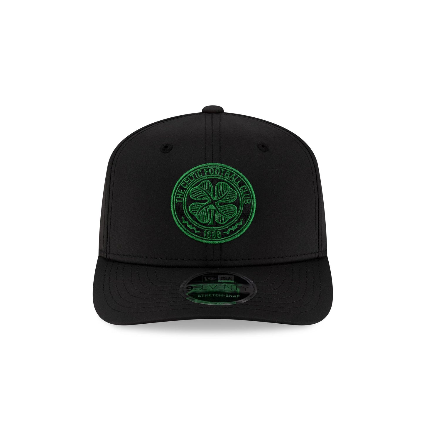 The Celtic FC Core Black 9SEVENTY Stretch-Snap Cap features an embroidered Celtic FC logo at the front panels against a satin fabrication throughout. Additional details include a snapback closure at the rear and a black undervisor.