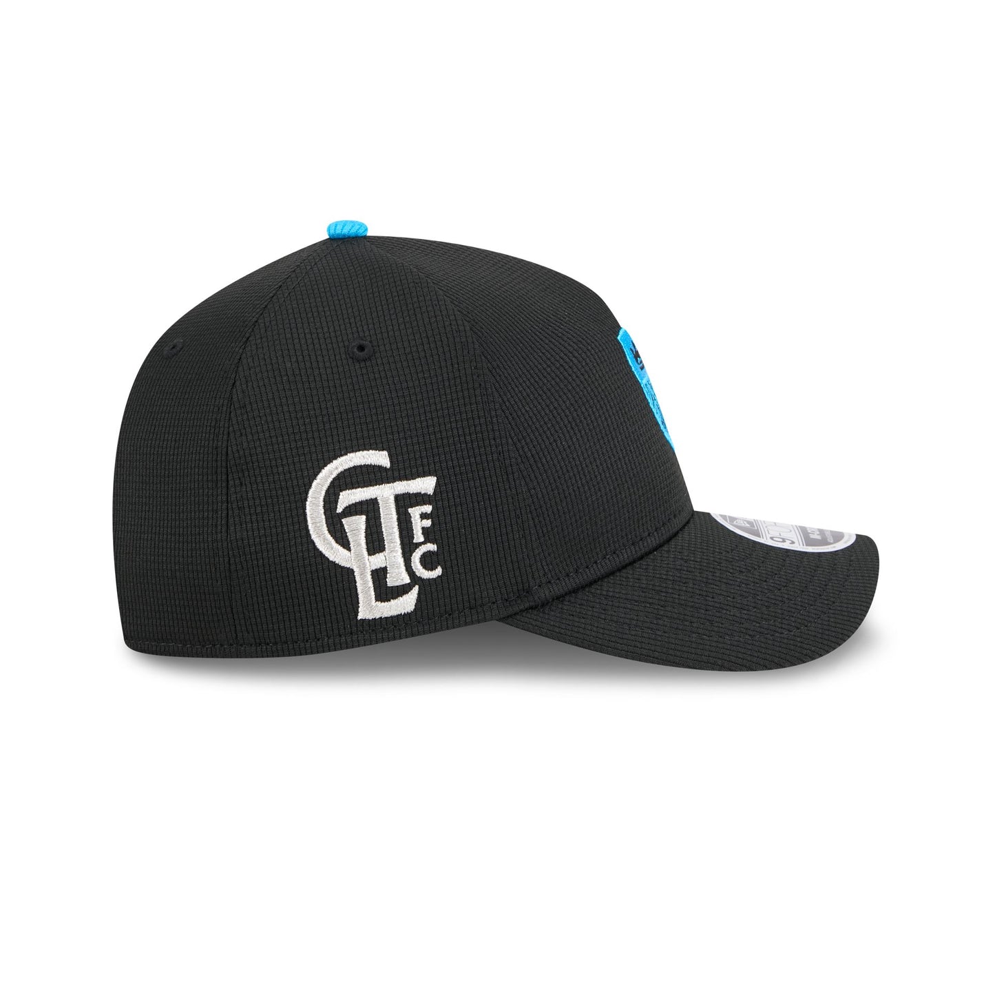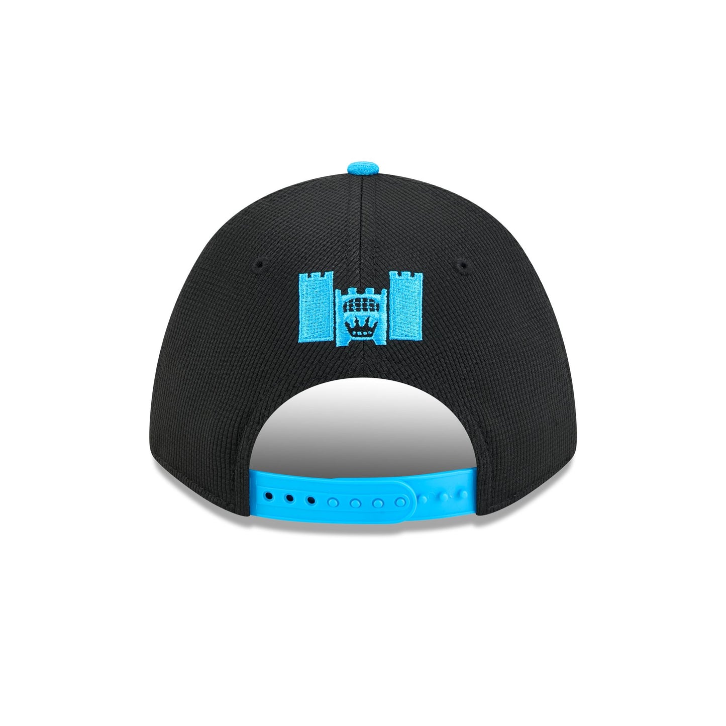 The Charlotte FC 2025 Jersey Hook 9FORTY M-Crown A-Frame Snapback features an embroidered Charlotte FC logo at the front panels with a patch at the right-wear side. Additional details include a castle above a snapback closure at the rear.