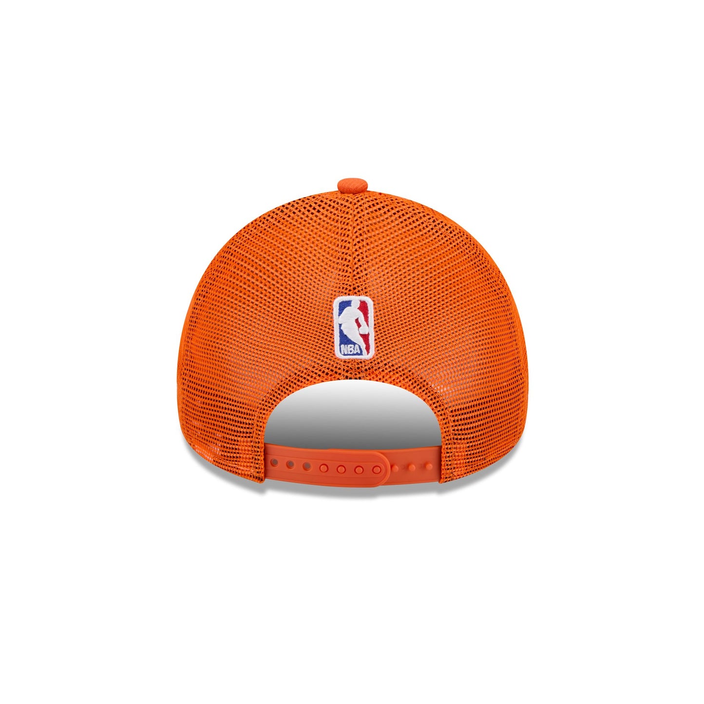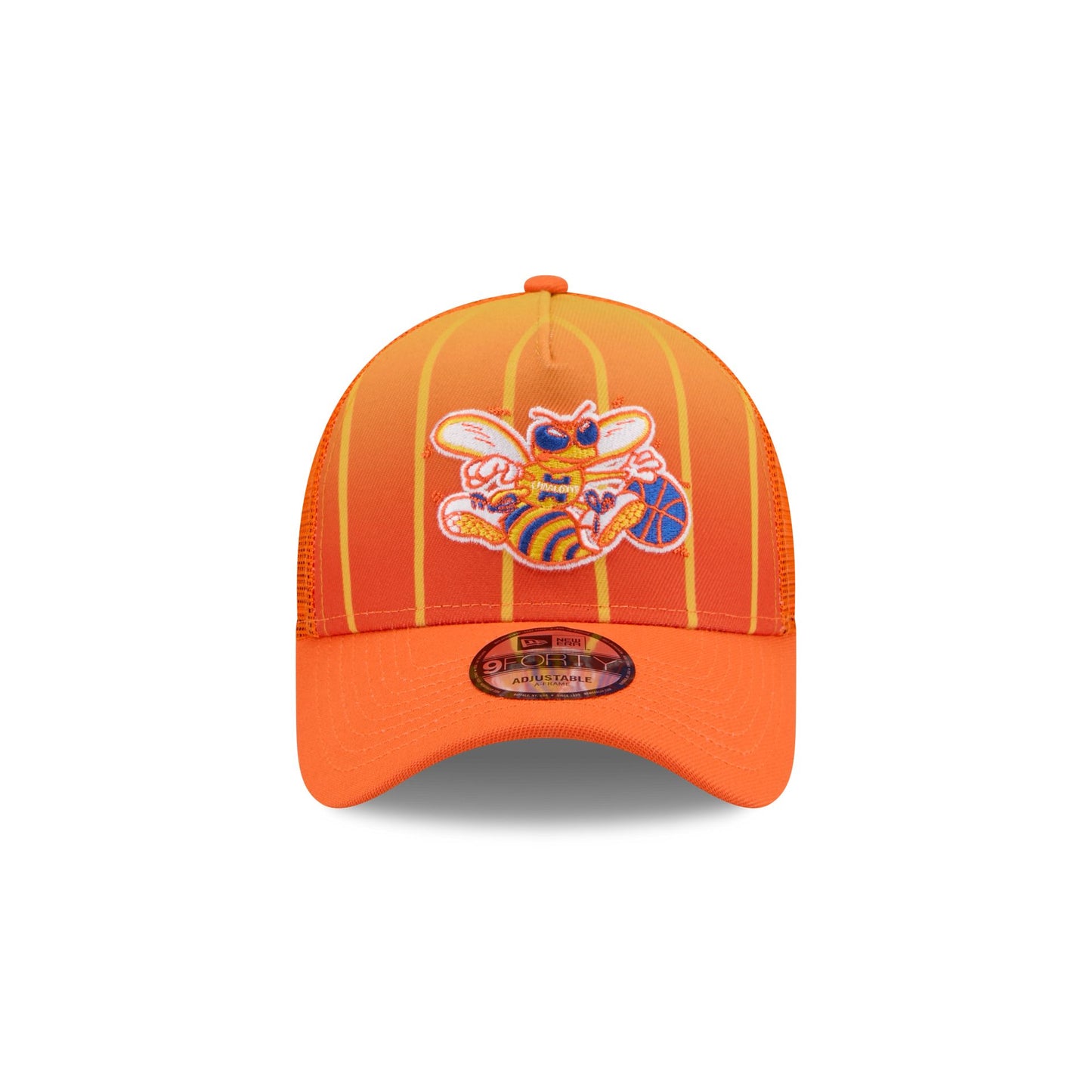 The Charlotte Hornets 2025 City Edition 9FORTY A-Frame Trucker features an embroidered Hornets City Edition logo at the front panels with a logo at the right-wear side. Additional details include the NBA Logoman above an adjustable snapback closure at a mesh rear and a gray undervisor.