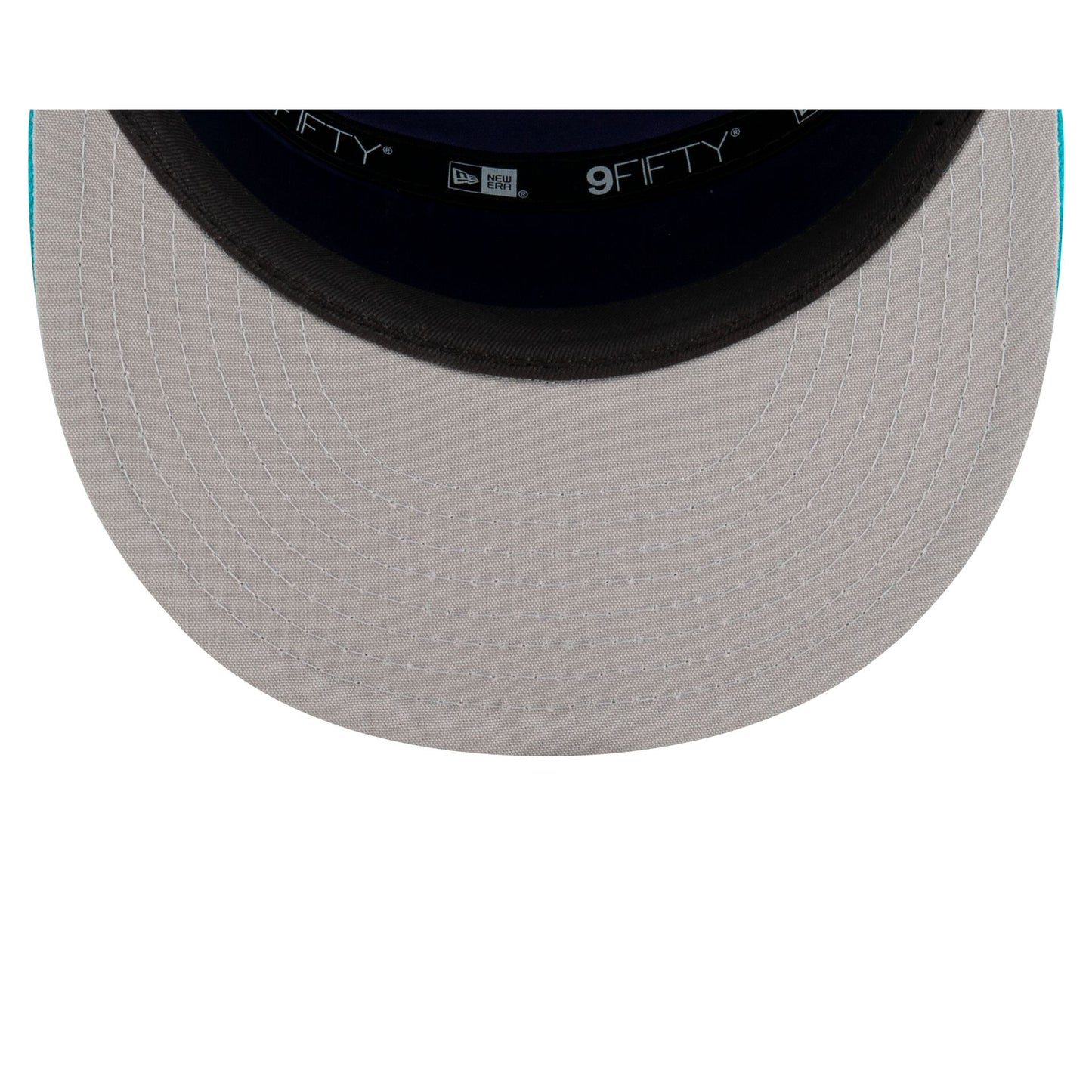The Charlotte Hornets 2025 Tip-Off Split Panel 9FIFTY Snapback features an embroidered Hornets logo at the front panels against a pinstripe jersey fabrication with the NBA Logoman at the right-wear side. Additional details include an adjustable snapback closure at the rear and a gray undervisor.