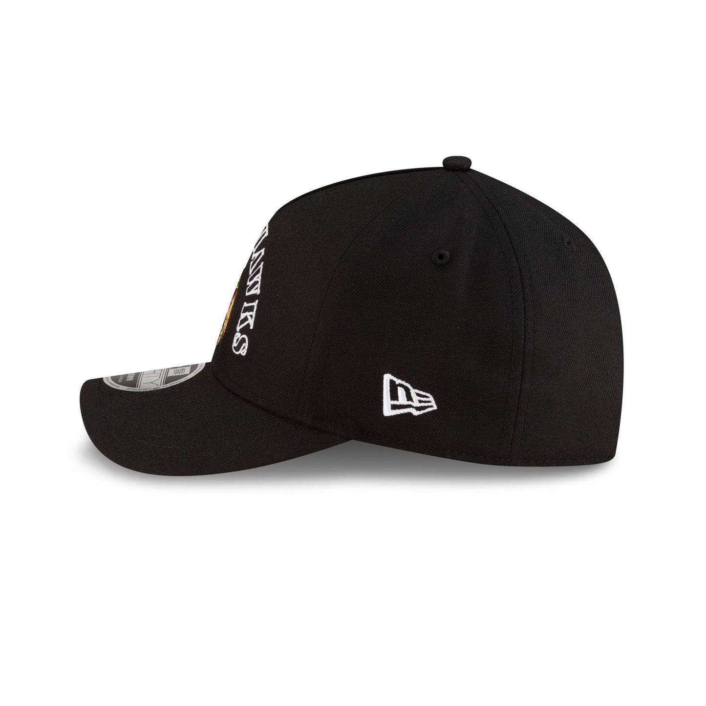 The Chicago Blackhawks Retro Arch 9FORTY M-Crown A-Frame Snapback features an embroidered Blackhawks arched wordmark and logo at the front panels with the NHL Shield above an adjustable snapback closure at the rear and a gray undervisor.