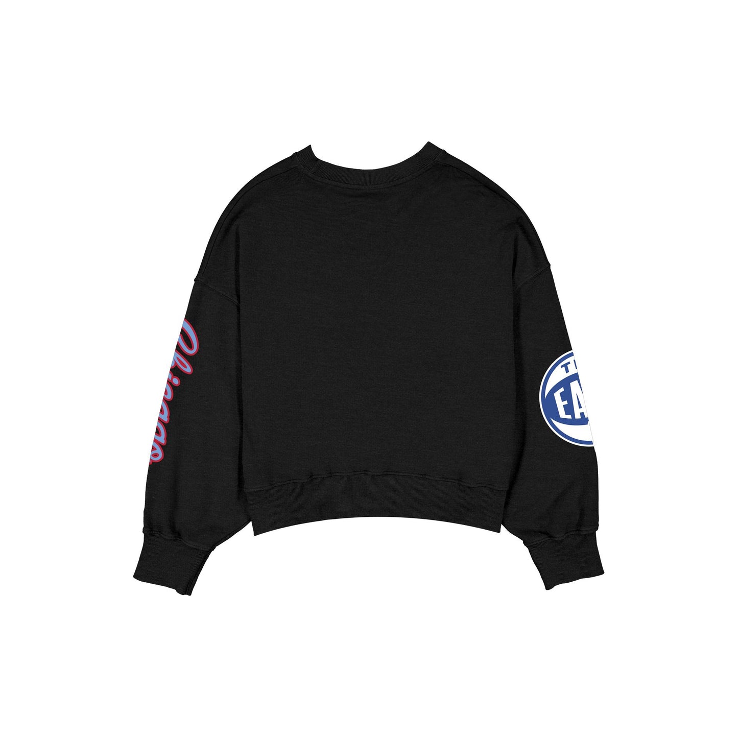 The Chicago Bulls 2025 City Edition Women's Crewneck features a screen-printed Bulls City Edition graphic at the front, a conference patch at the right sleeve, and a wordmark at the left sleeve.