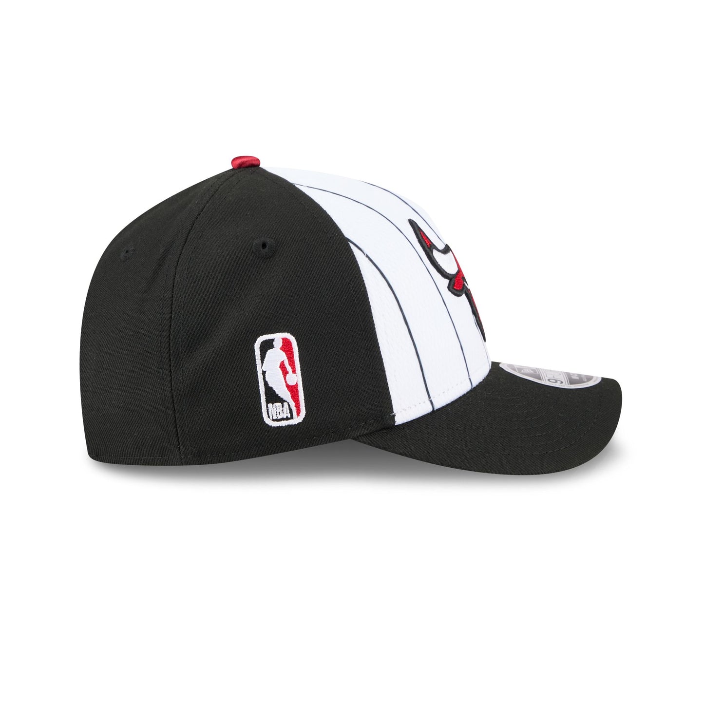The Chicago Bulls 2025 Tip-Off 9FORTY M-Crown A-Frame Snapback features an embroidered Bulls logo at the front panels against a pinstripe jersey fabrication with the NBA Logoman at the right-wear side. Additional details include an adjustable snapback closure at the rear and a gray undervisor.