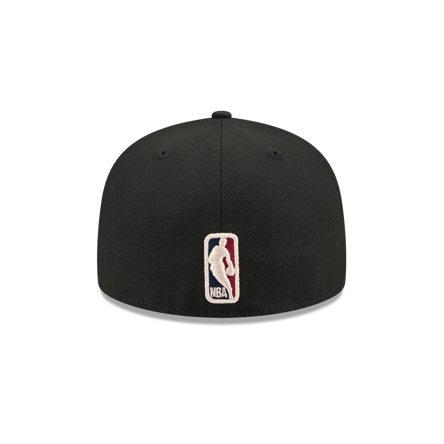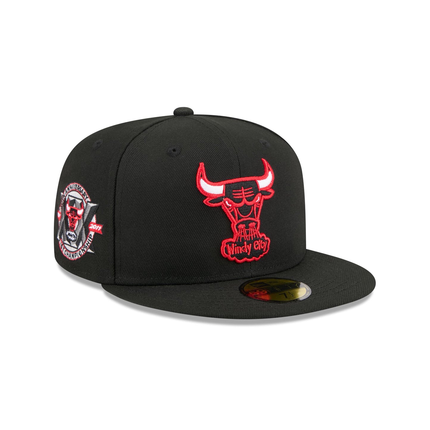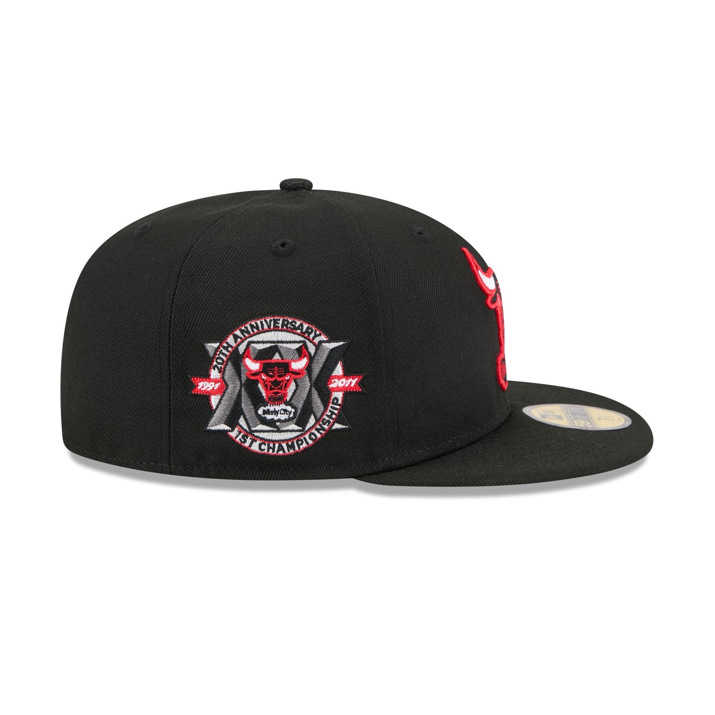 The Chicago Bulls 1960-1970 Hardwood Classics Sidepatch 59FIFTY Fitted Cap features an embroidered vintage Bulls logo at the front panels with a 20th Anniversary patch at the right-wear side. Additional details include the NBA Logoman at the rear and a gray undervisor.